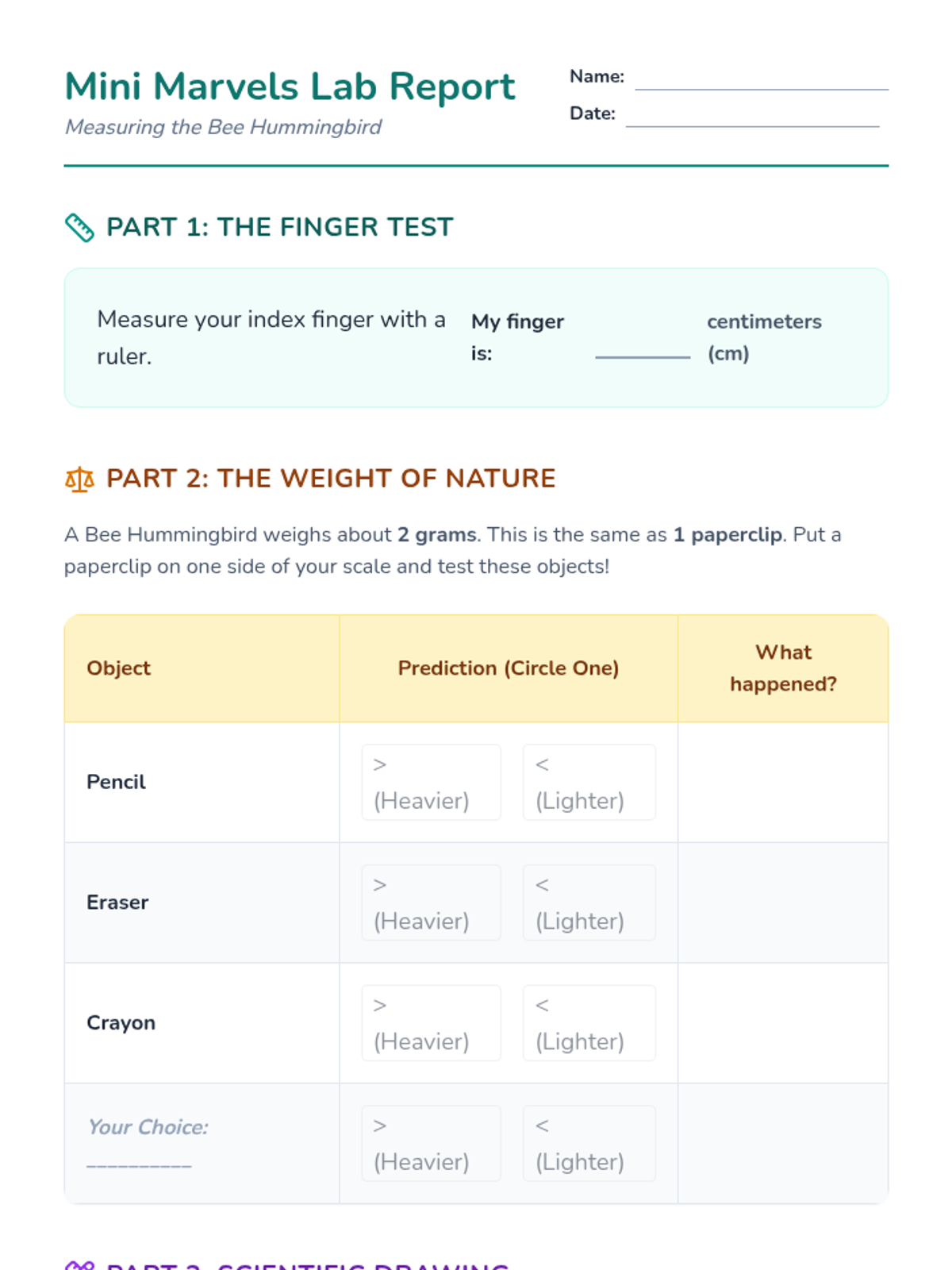 A student worksheet for the Bee Hummingbird measurement lesson, featuring a finger measurement section, a weight prediction table using balance scales, and a scientific drawing reflection area.