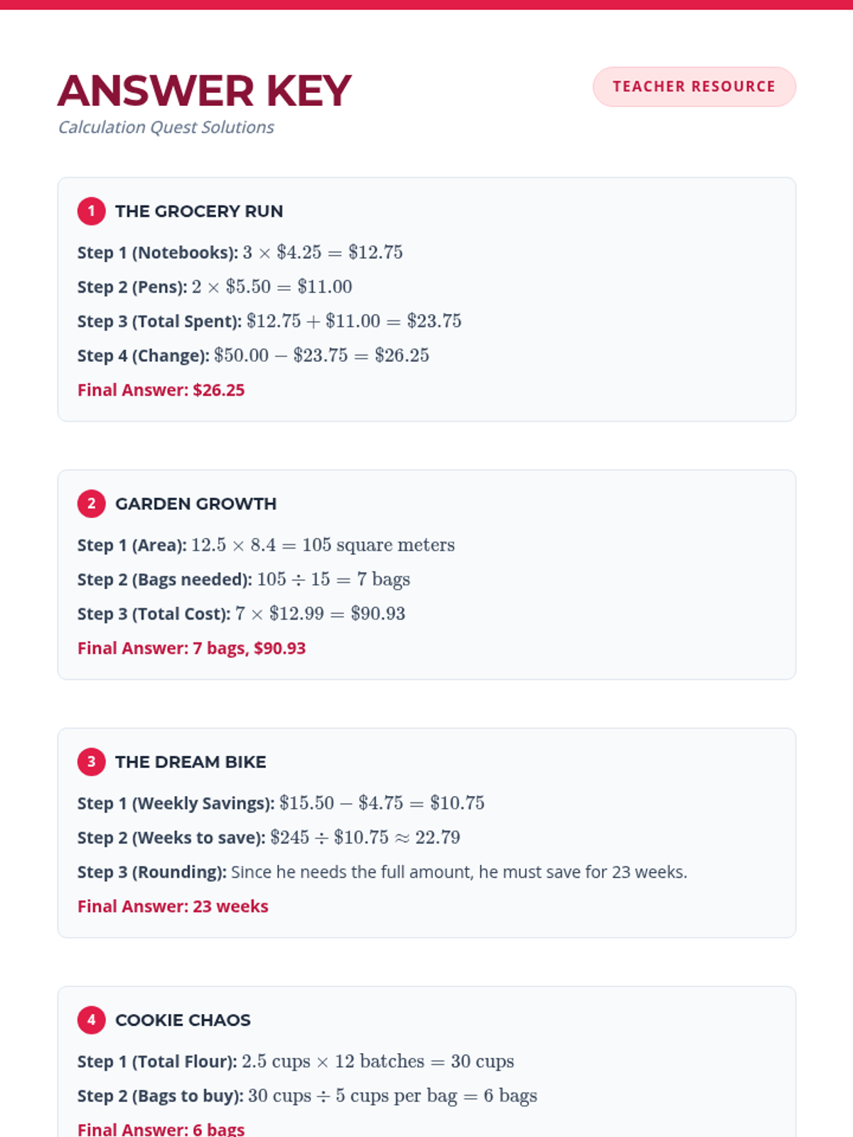 A comprehensive answer key for the Boundary Blitz Task Cards, including detailed calculation steps for complex deduction and multi-step word problems.