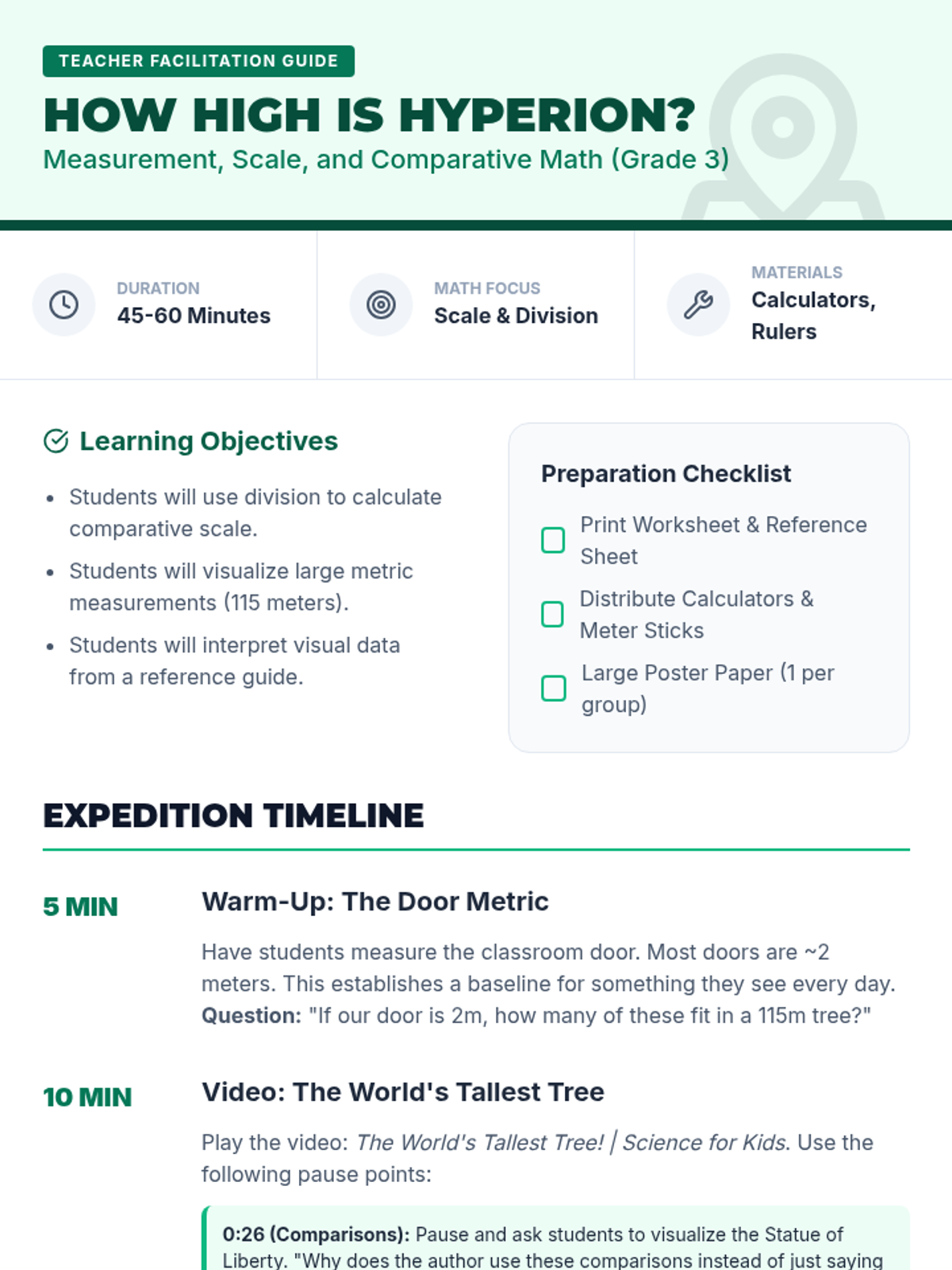 A comprehensive teacher guide for the 'How High is Hyperion' lesson, including pacing, discussion prompts, calculation answer keys, and facilitation tips.