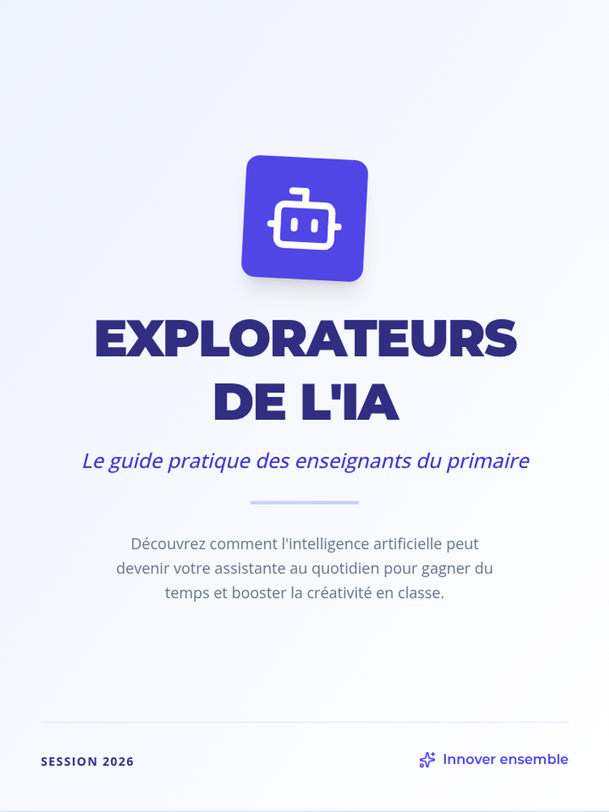 Un livret de 6 pages conçu pour les enseignants du primaire, présentant les bases de l'IA, des astuces de productivité, la méthode de prompting RTC, et les enjeux éthiques. Visuel moderne et pédagogique.