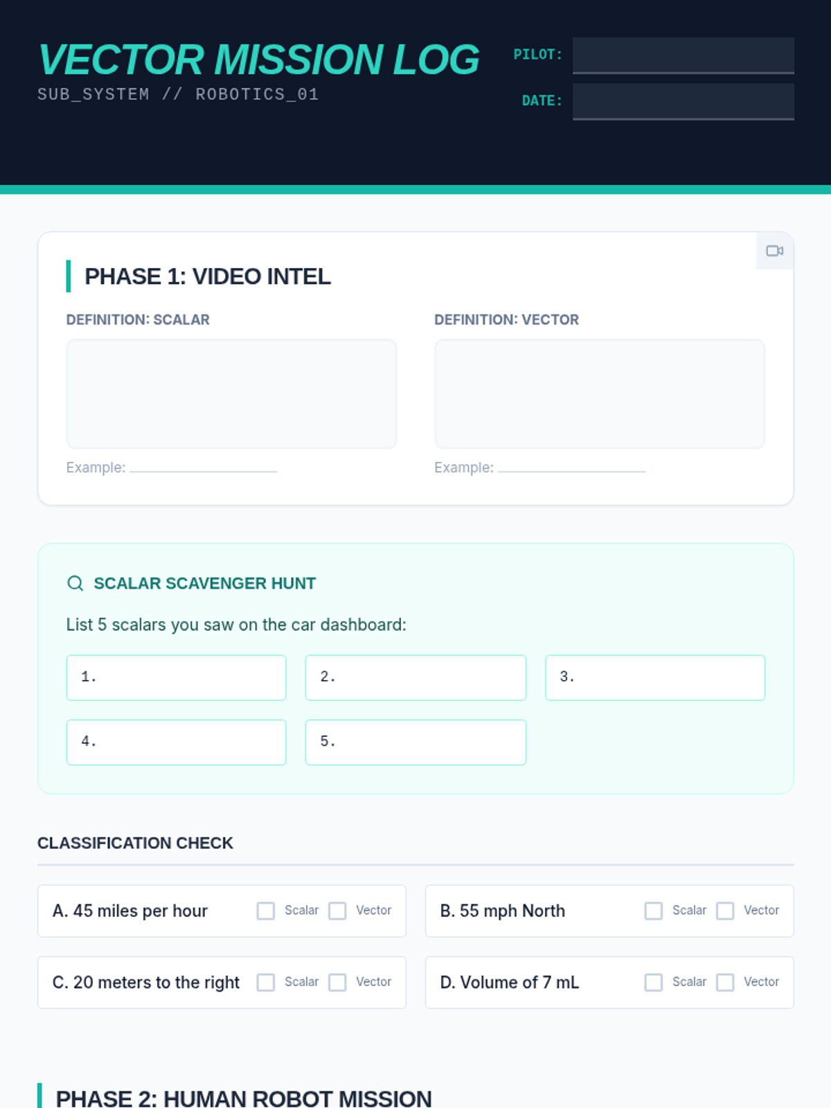 A student worksheet for the Vector Command lesson, featuring sections for video notes, vector classification practice, and an activity log for the 'Human Robot' maze. Writing areas have light backgrounds for legibility.