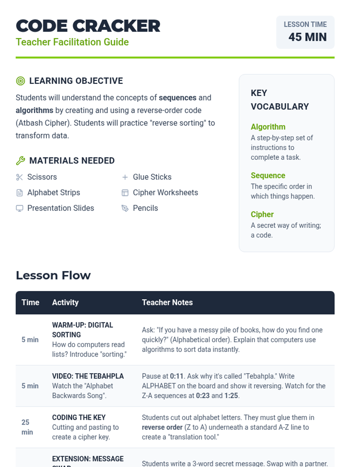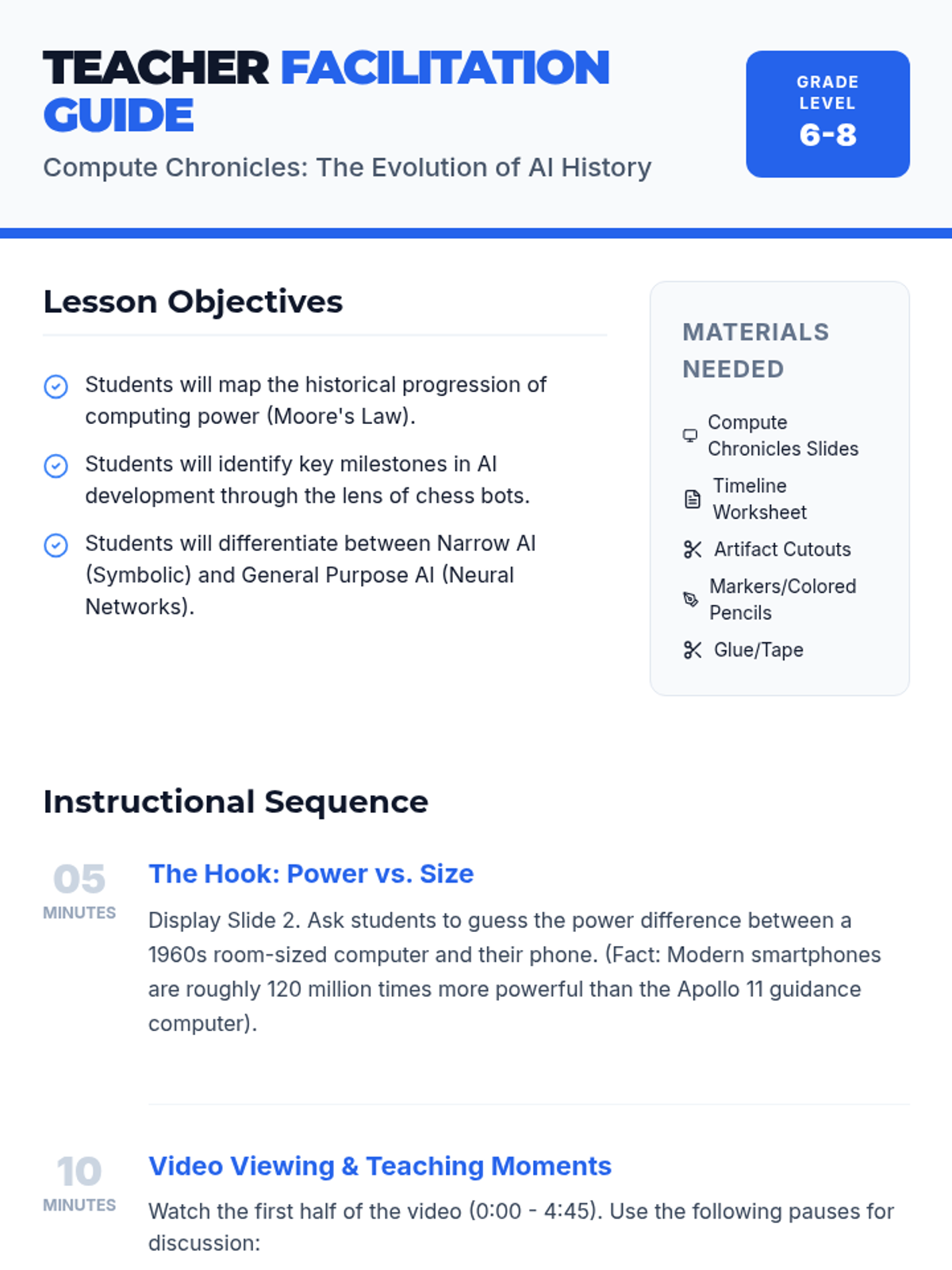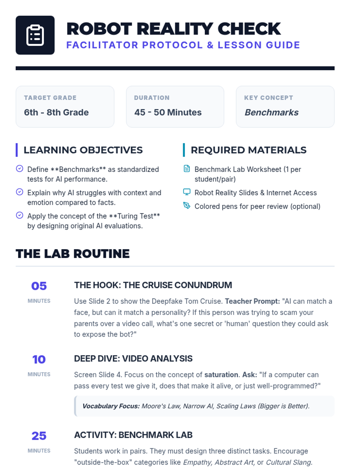 A comprehensive teacher facilitation guide for the Robot Reality Check lesson, including pacing, discussion prompts, and differentiation strategies.