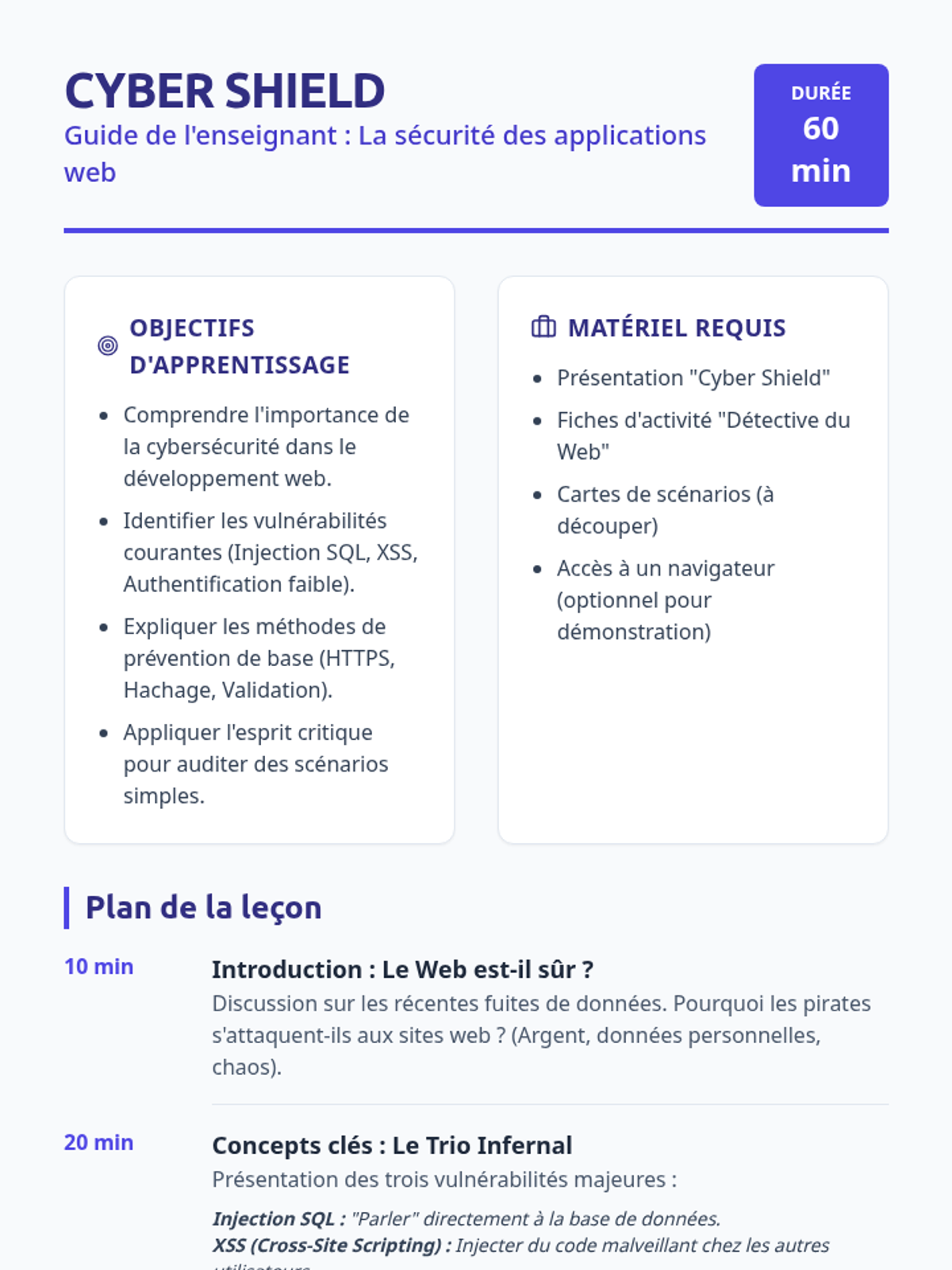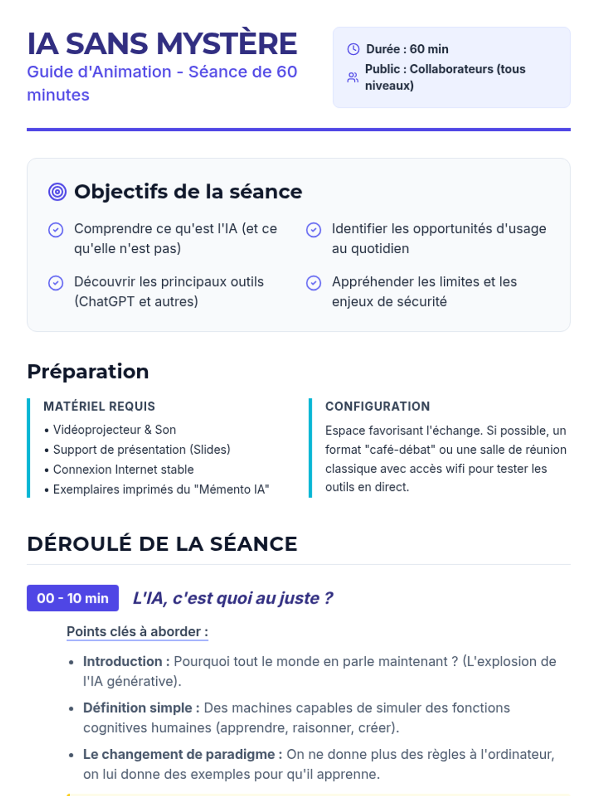Un guide d'animation complet pour une séance d'une heure, incluant le minutage, les points clés et des conseils pour l'animateur.