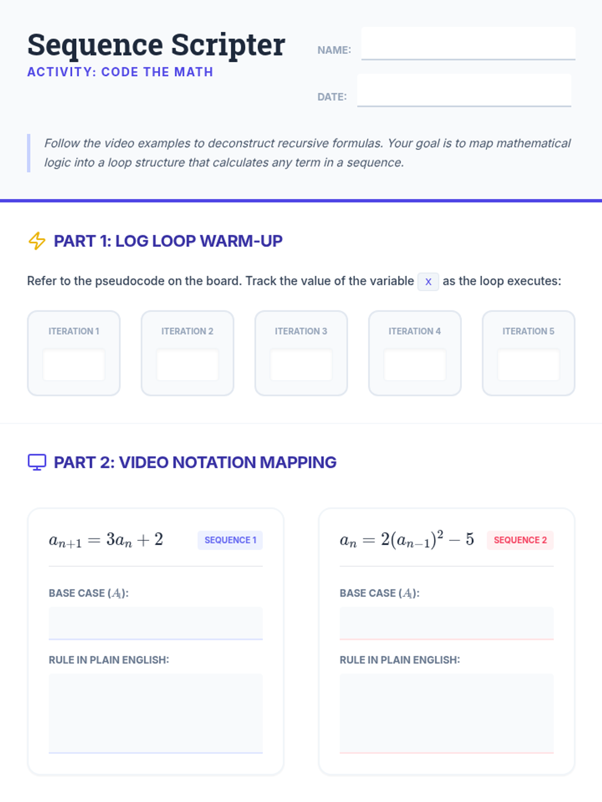 Updated student activity worksheet for 'The Loop Link' lesson, featuring improved handwriting spaces (min 32px height), enhanced name/date fields, and a clearer logic workbench for pseudocode drafting.