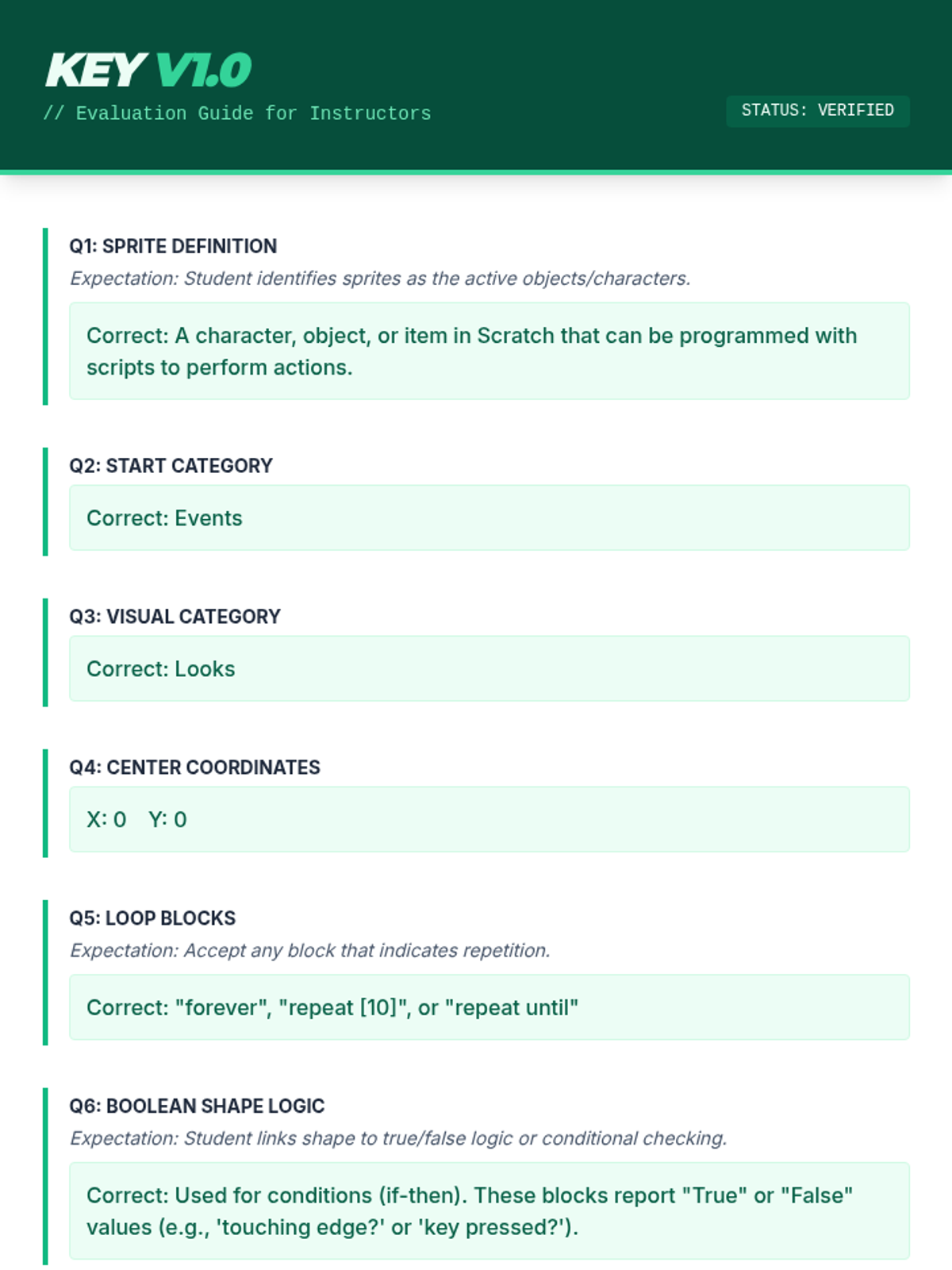 Instructor key for the Block Logic assessment, providing correct answers, acceptable variations, and grading criteria.