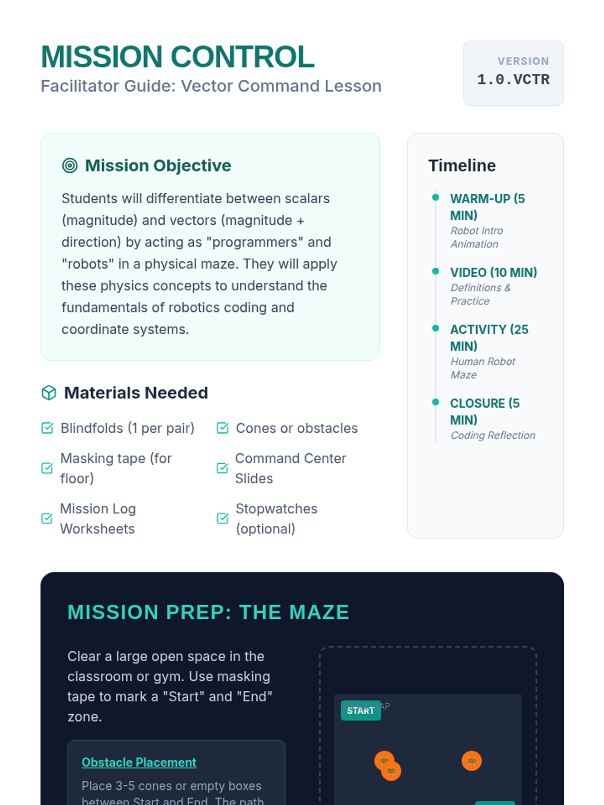 A comprehensive facilitator guide for teachers leading the Vector Command lesson, featuring maze setup diagrams, activity scripts, and video discussion prompts.