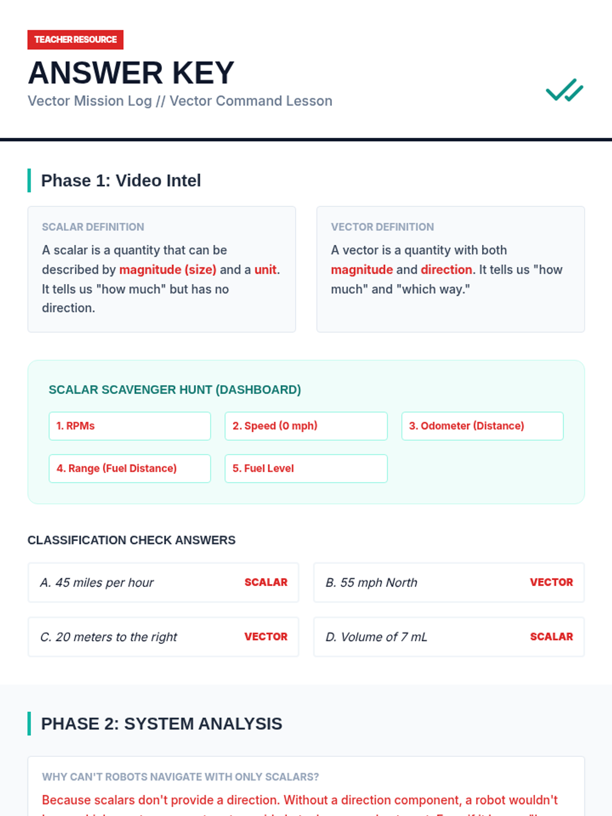 An answer key for the Vector Mission Log Worksheet, providing teachers with definitions, scavenger hunt solutions, and practice classification answers.