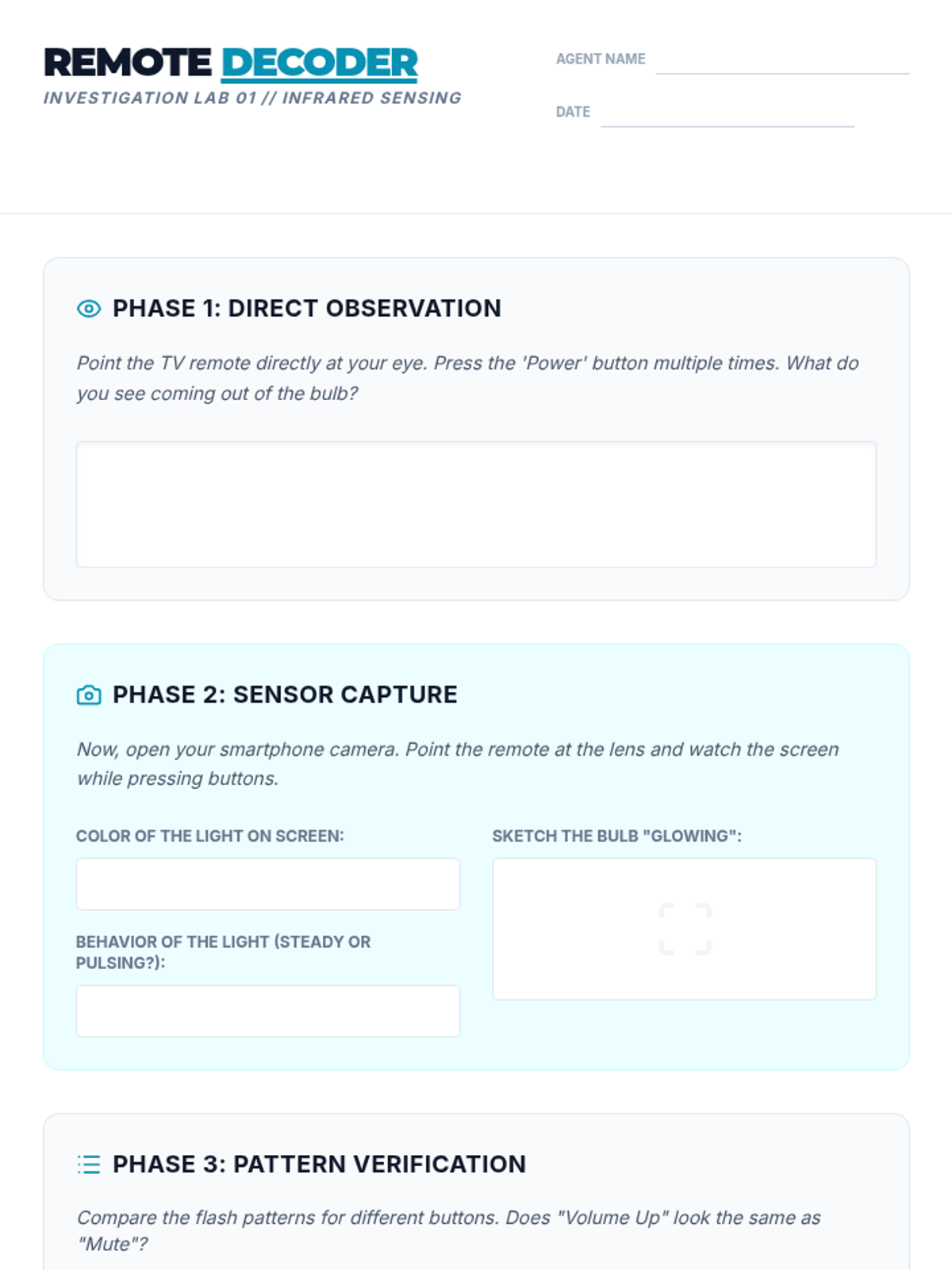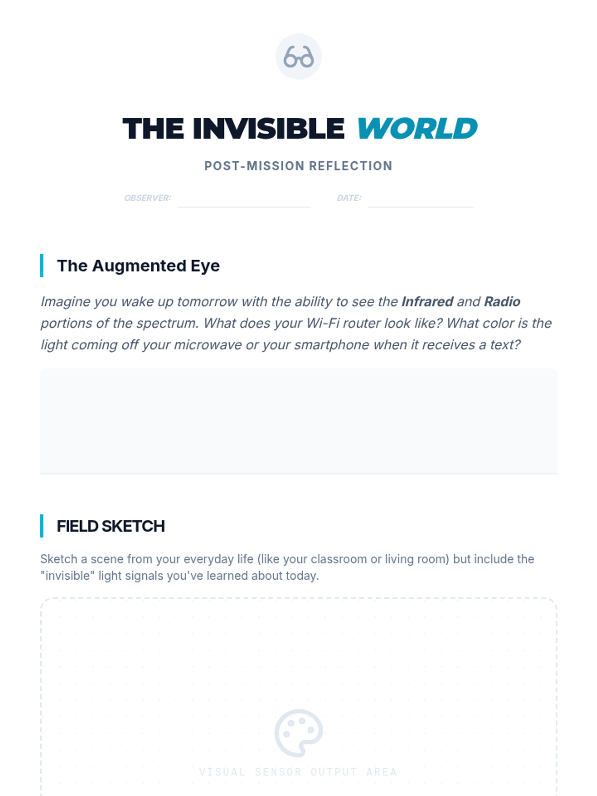 A reflection journal sheet for students to describe and sketch their ideas of a world where non-visible light (like infrared and radio waves) is visible.