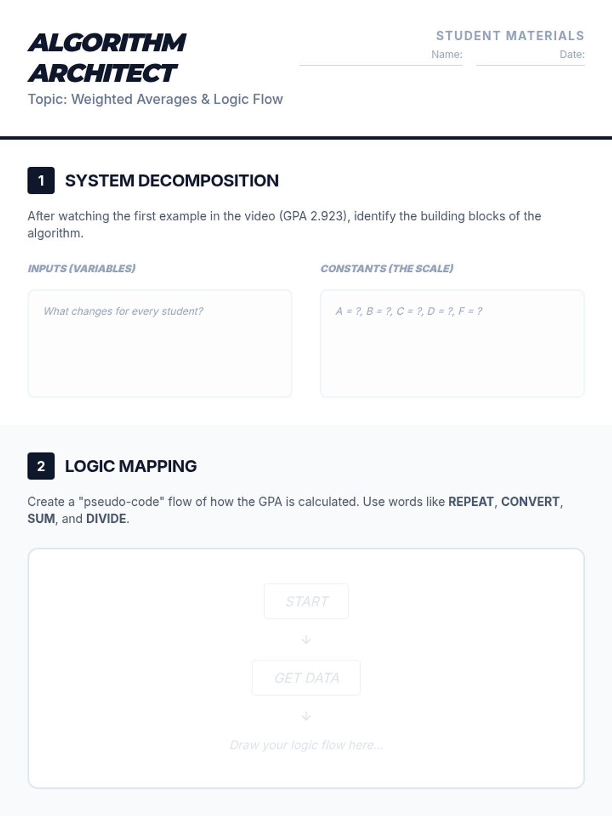 Student activity worksheet for decomposing GPA calculation logic and writing pseudocode or code to solve weighted average problems.
