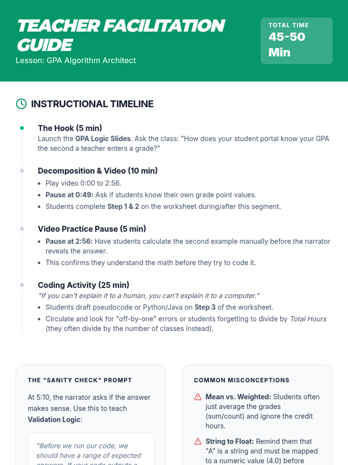Facilitation guide for teachers to manage pacing, discussion points, and common misconceptions for the GPA Algorithm lesson.