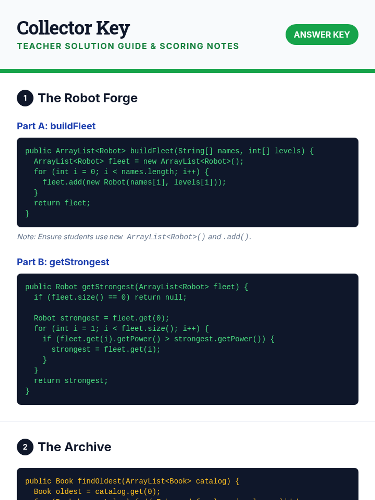The official answer key and scoring guide for the Object Collector FRQs, featuring full Java implementations and pedagogical notes for teachers.