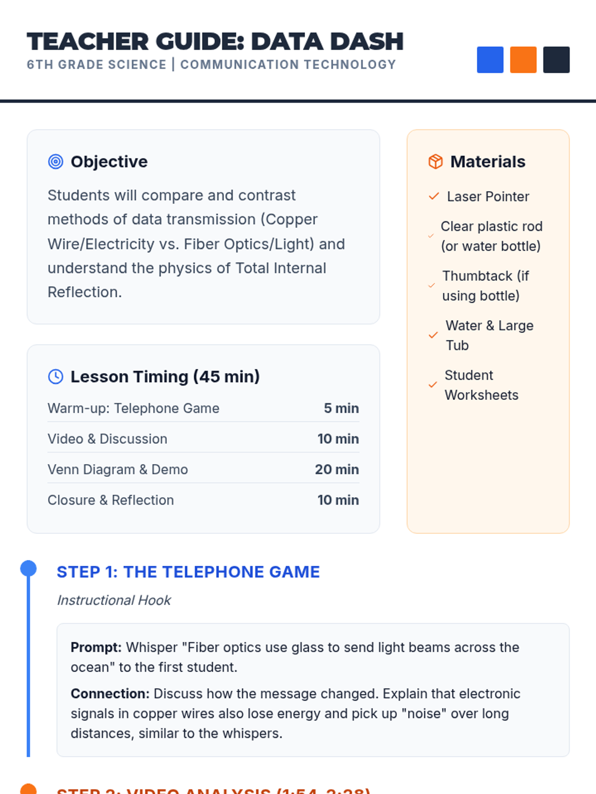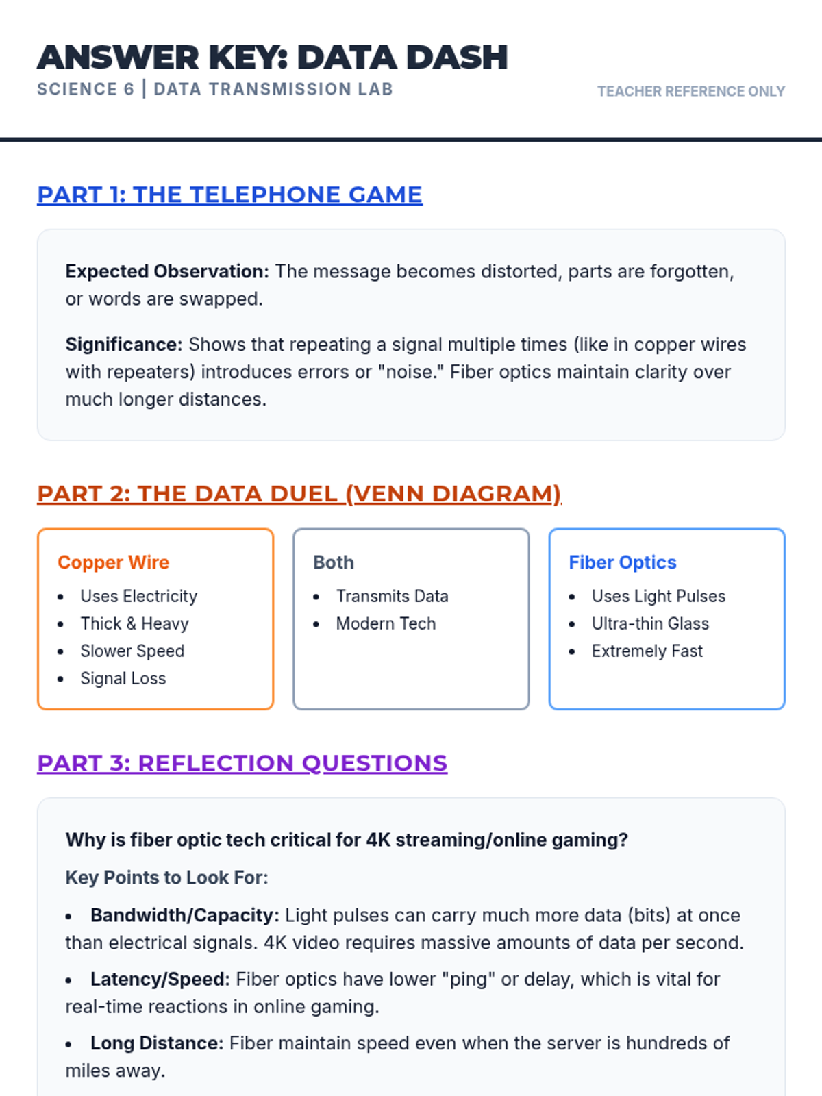 A comprehensive teacher's guide for the "Speed of Signals" lesson, featuring pacing, prep notes, and an answer key.
