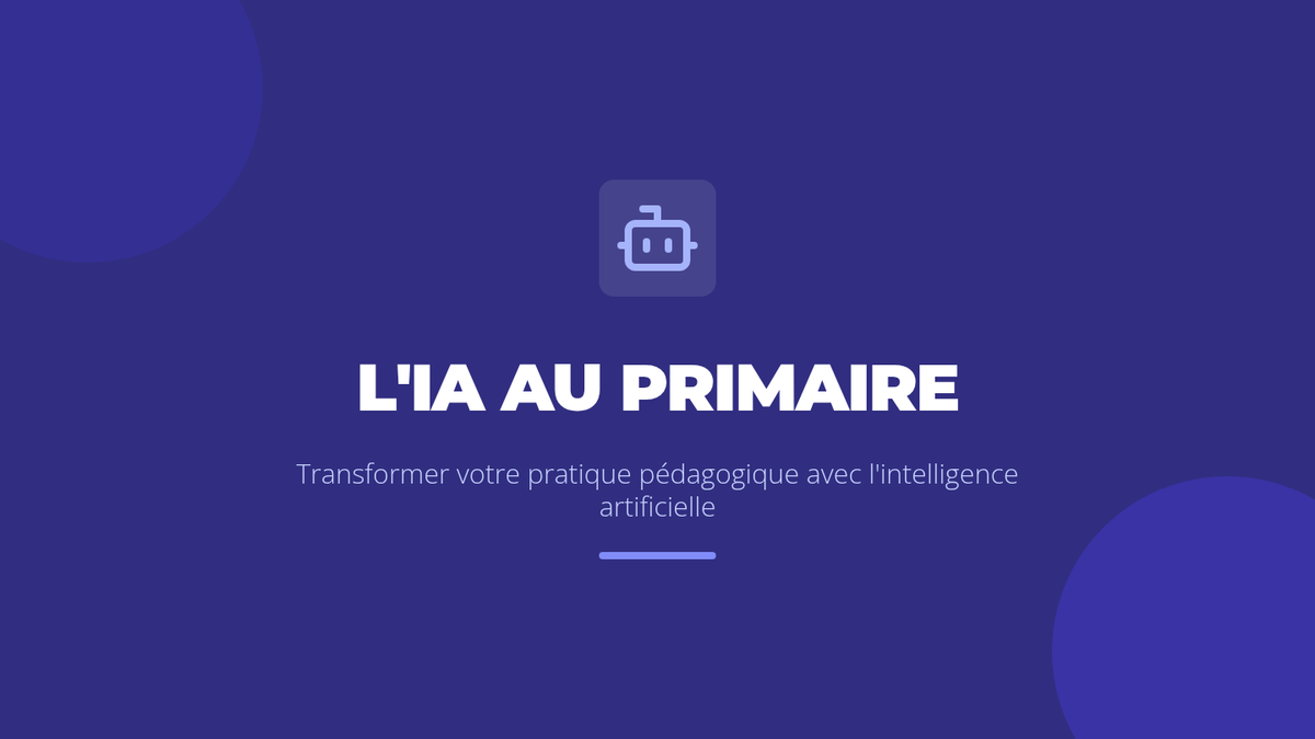 Une présentation de 6 diapositives pour animer une formation sur l'IA destinée aux enseignants du primaire. Couleurs vives, textes larges (>24px) et structure pédagogique claire.