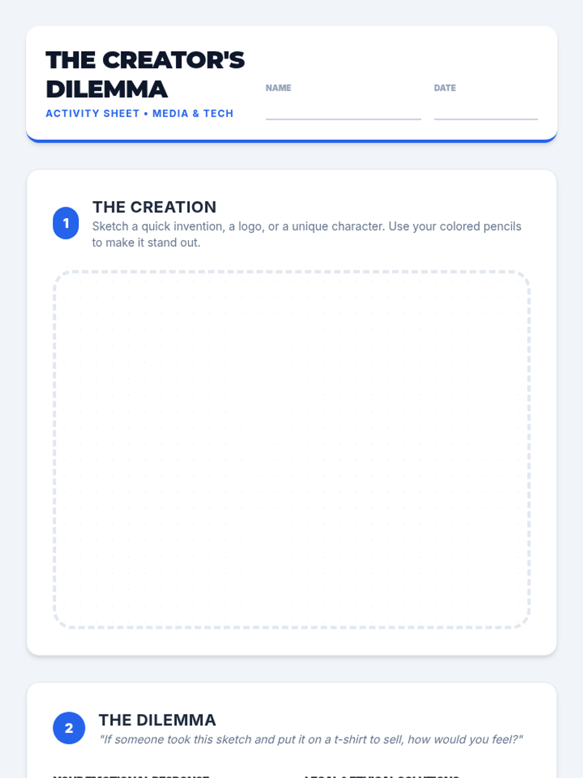 A student brainstorming worksheet to help plan the narrative beats, physical interfaces, and programming logic for their circuit story.