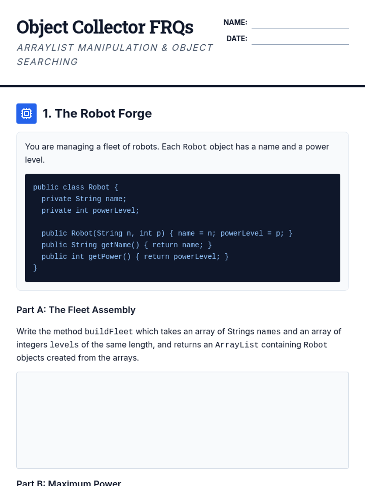 A worksheet containing three Java Free Response Questions focusing on ArrayList declaration, object instantiation, and searching algorithms (finding min/max/average).