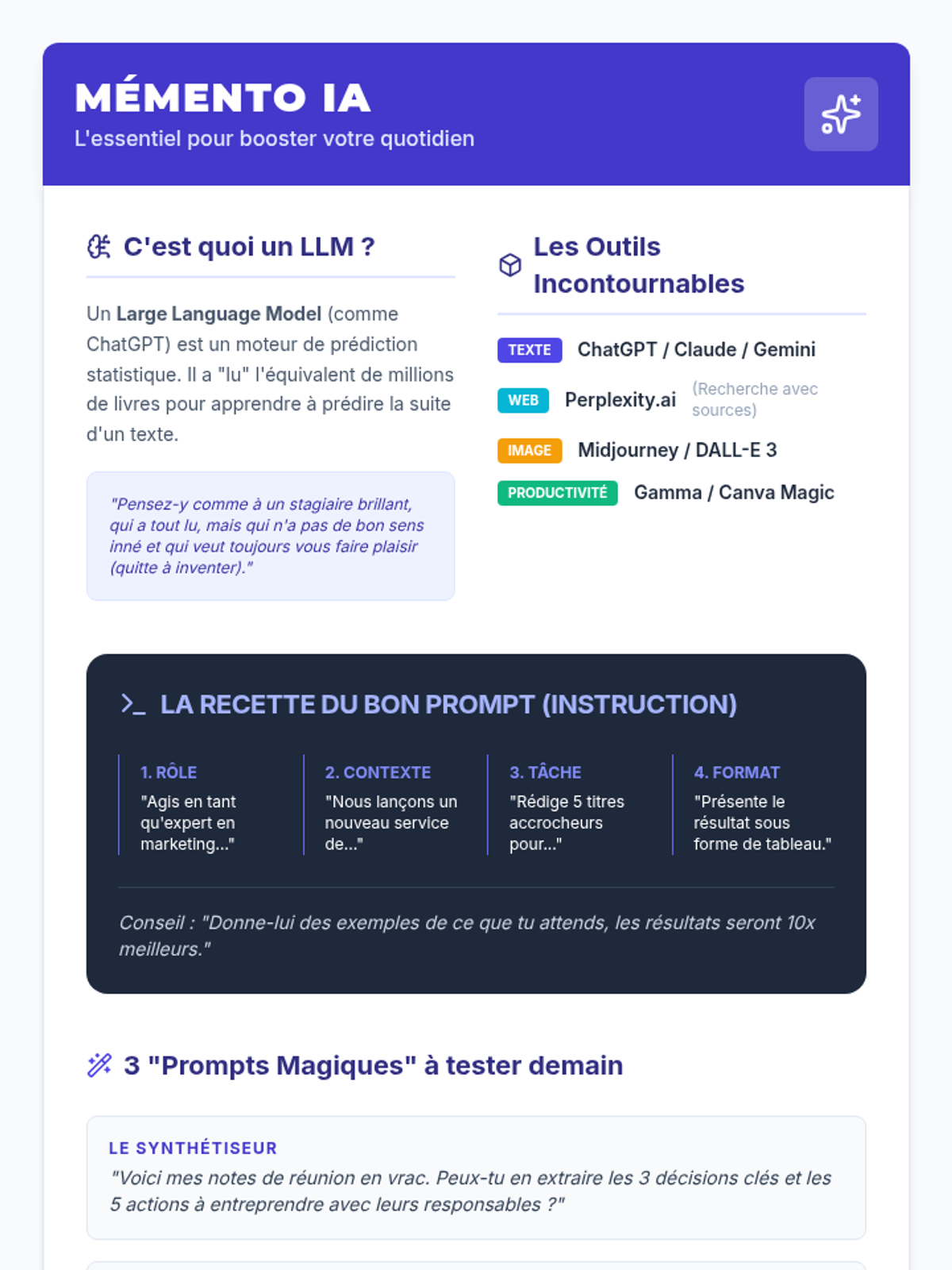 Une fiche aide-mémoire (cheat sheet) au format A4 pour les enseignants, regroupant la méthode RTC, des modèles de prompts prêts à l'emploi et des conseils de sécurité. Pratique à garder sur son bureau.