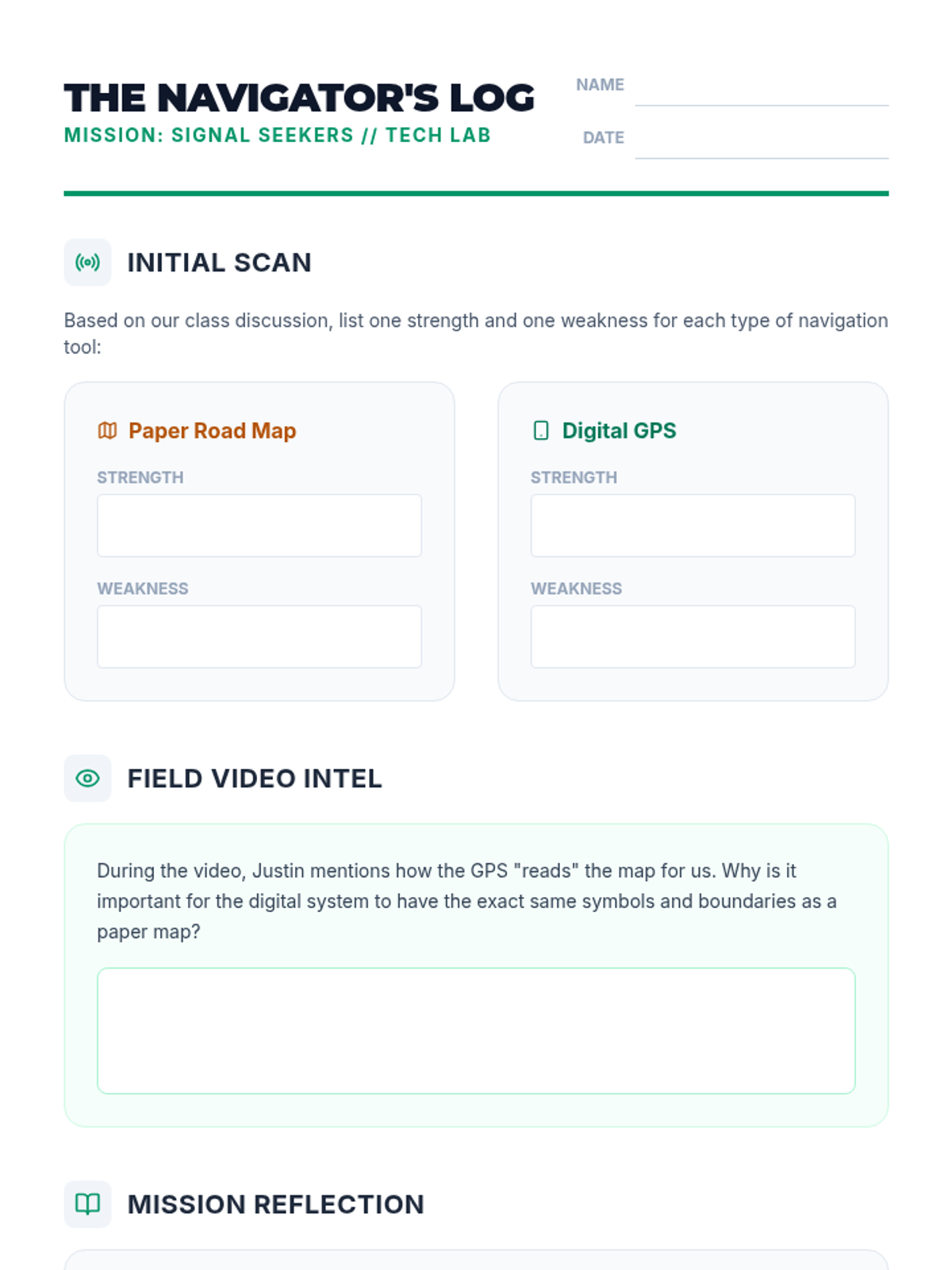 A high-energy, futuristic slide deck for teaching the transition from paper maps to GPS. It includes a hook, key vocabulary, the embedded lesson video, and instructions for the 'Human GPS' activity.