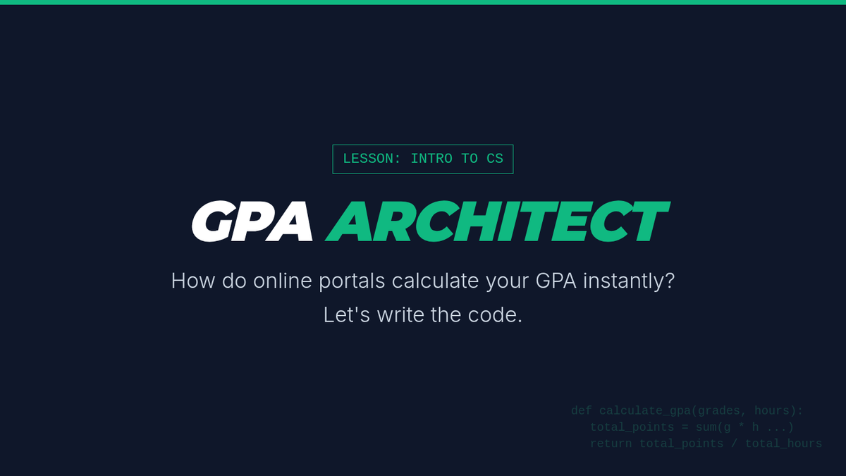 Visual presentation for the GPA Algorithm Architect lesson, including the hook, video analysis prompts, and coding challenge requirements.