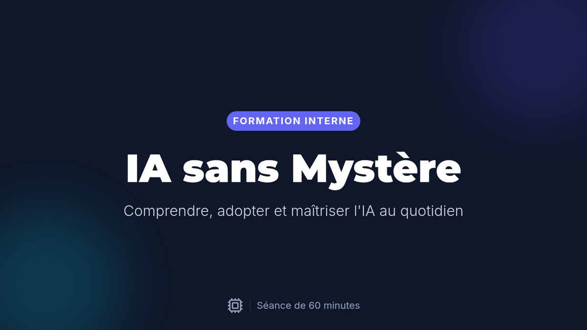 Support visuel dynamique et professionnel pour la séance de présentation de l'IA, couvrant les définitions, les usages et les limites.