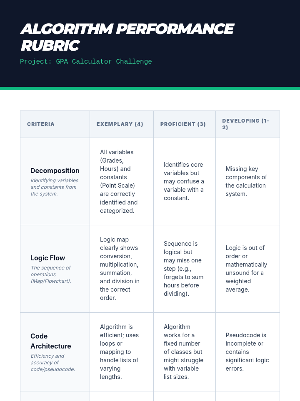 Assessment rubric for evaluating student performance in system decomposition, logic mapping, algorithm construction, and testing.