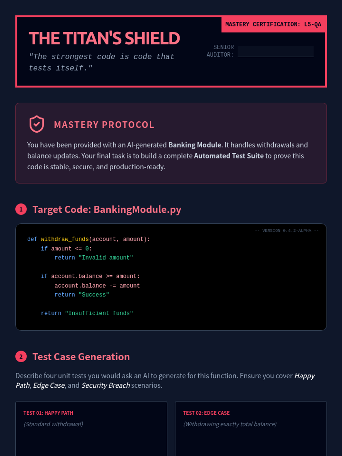 A final assessment lab where students design a unit test suite for an AI-generated banking module, including edge cases and mutation testing.