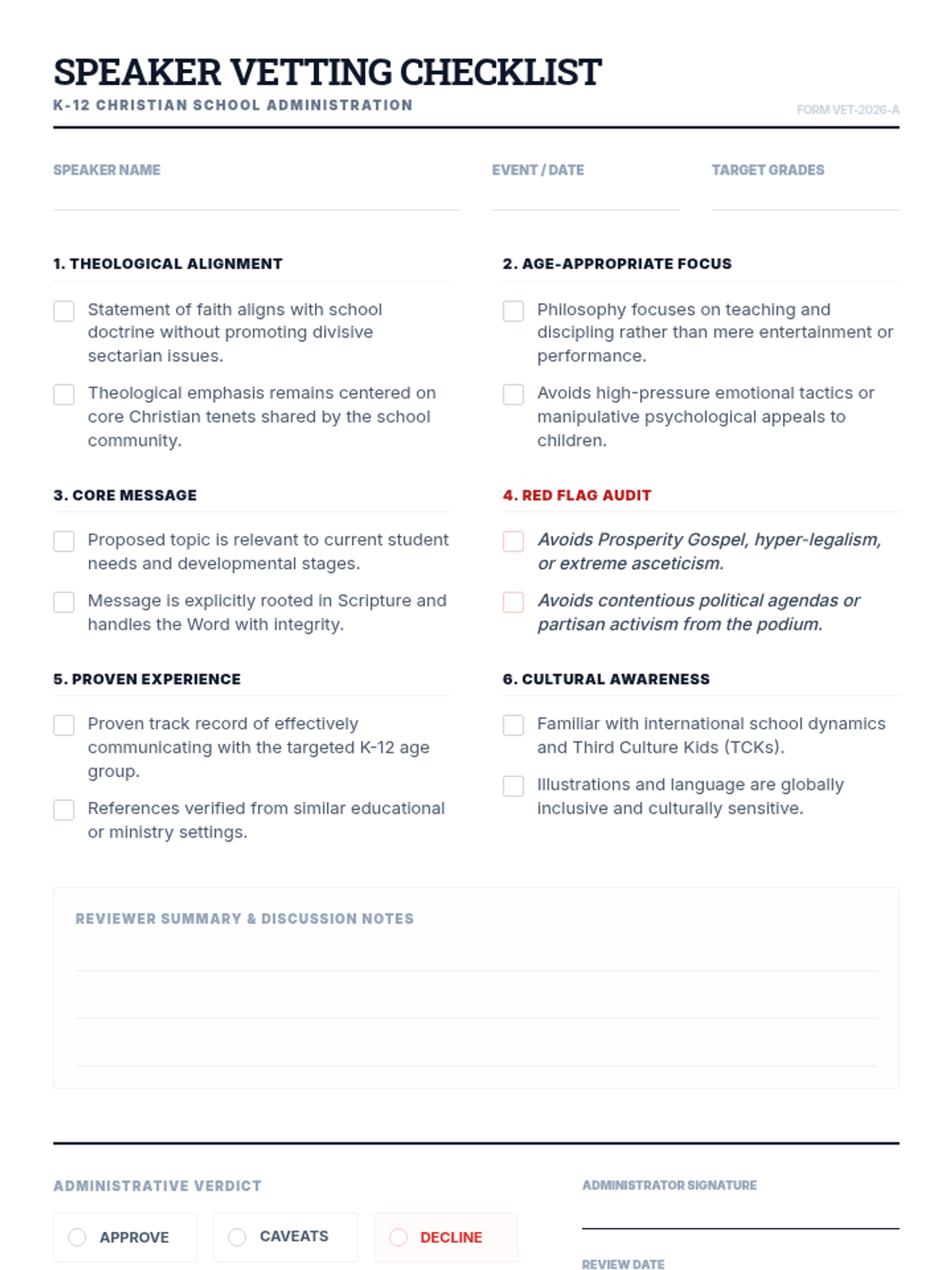 A refined, minimalist one-page speaker vetting checklist for K-12 Christian school administration, optimized with precise sizing and high readability.