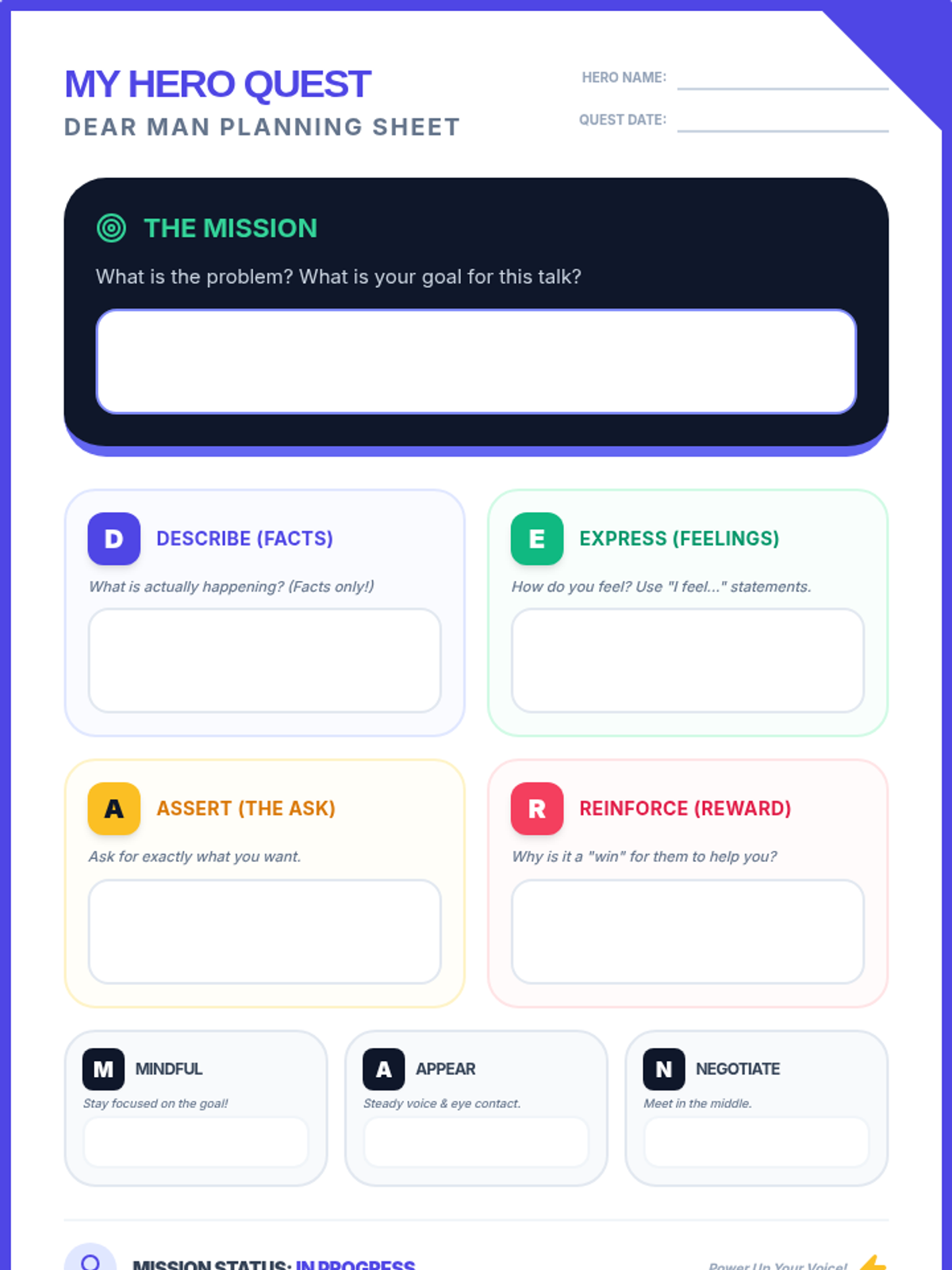 A student worksheet for planning a personalized DEAR MAN conversation, optimized for 8.5x11 printing with dedicated sections for each step of the model and a vibrant 'hero quest' gaming theme.