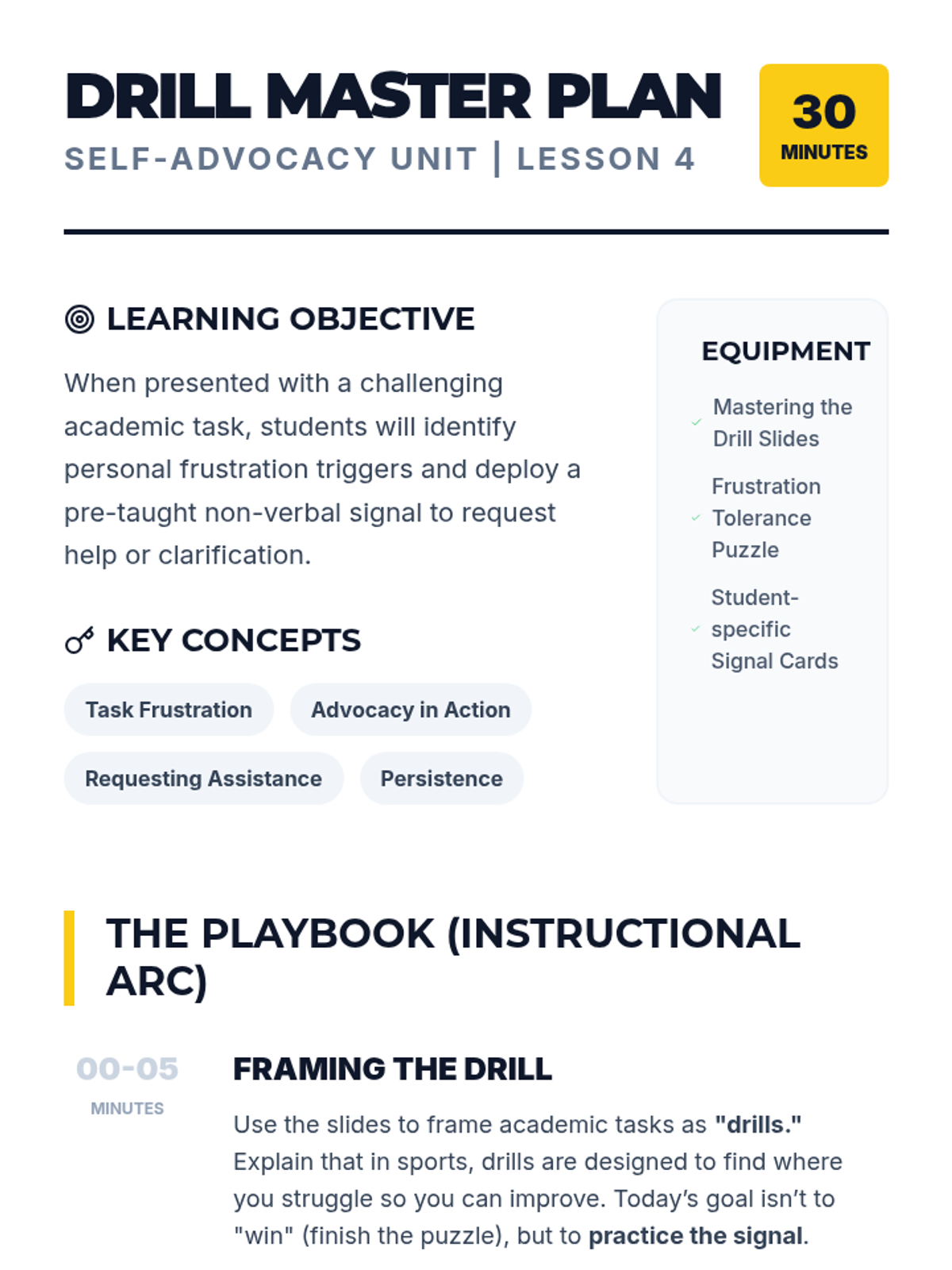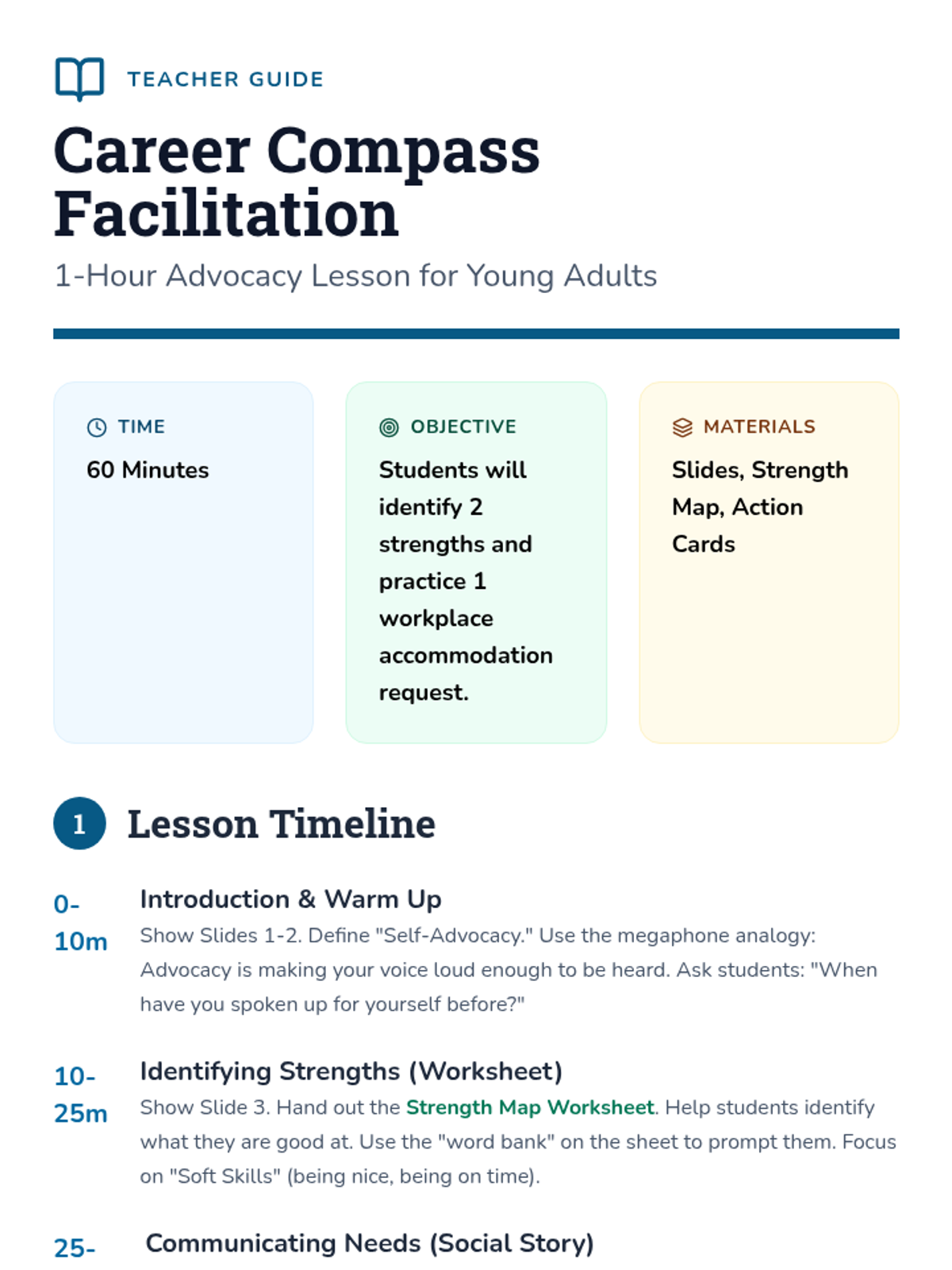 A comprehensive teacher guide for delivering the 1-hour advocacy lesson, including a minute-by-minute timeline, discussion prompts, and differentiation strategies for varying cognitive abilities.
