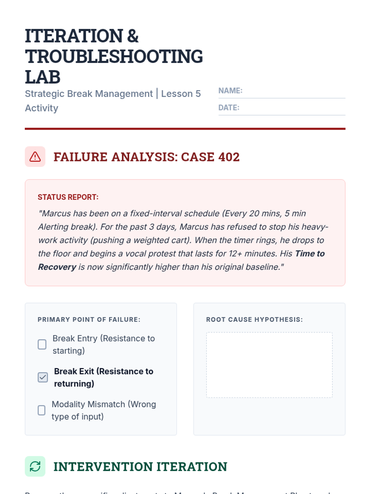 A worksheet for students to differentiate between restorative and depleting breaks, creating a personalized 'menu' of energy-management strategies.