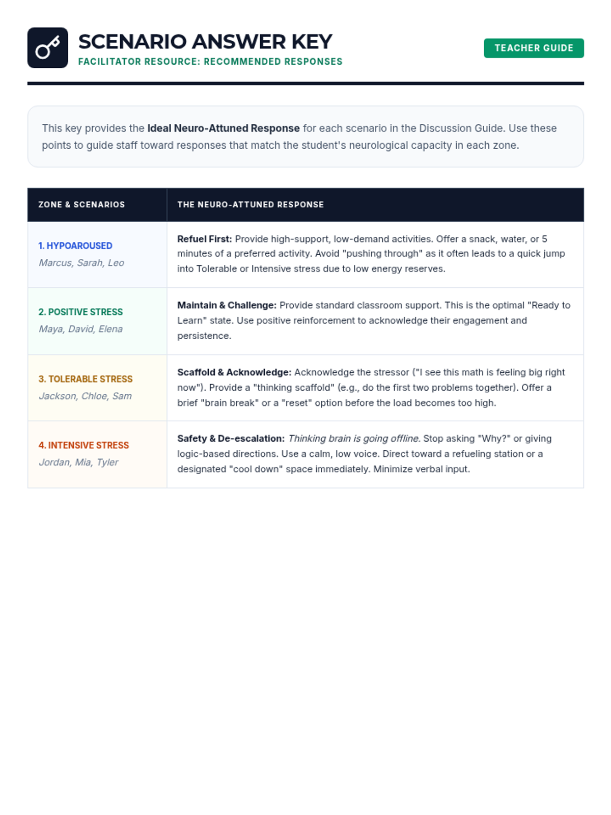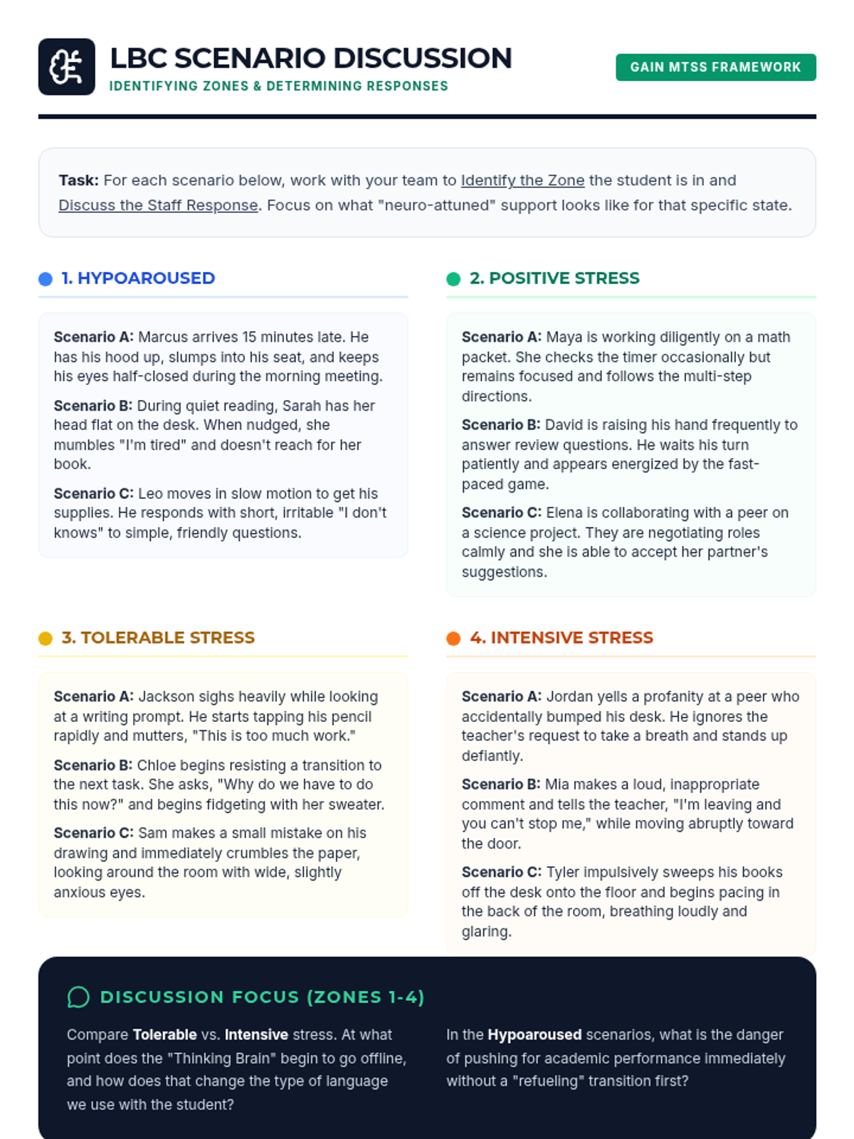 A comprehensive scenario-based discussion guide for staff, featuring 3 realistic classroom scenarios for each of the 8 zones in the Learning Behavior Cycle. Designed to build staff attunement and practice effective neuro-attuned responses.