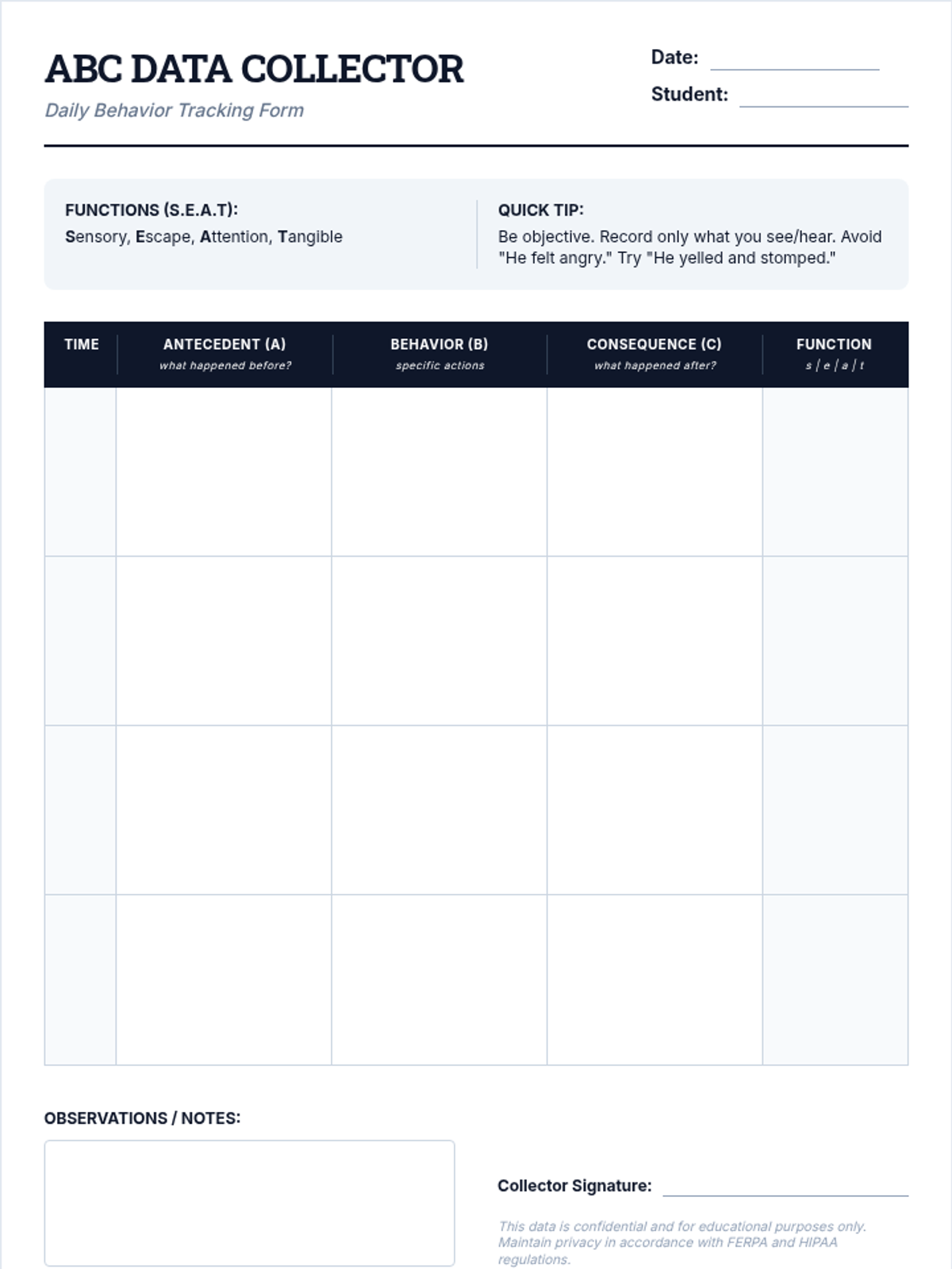 A professional ABC (Antecedent-Behavior-Consequence) data collection sheet for paraprofessionals to objectively track and document student behaviors.