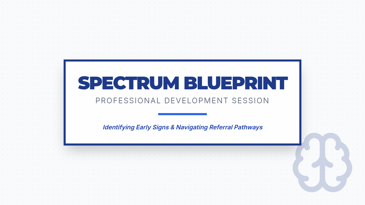A visual presentation for a professional development session on Autism Spectrum Disorder, featuring a blueprint aesthetic and covering key insights from the 'What is Autism?' video, discussion prompts, and the referral process.