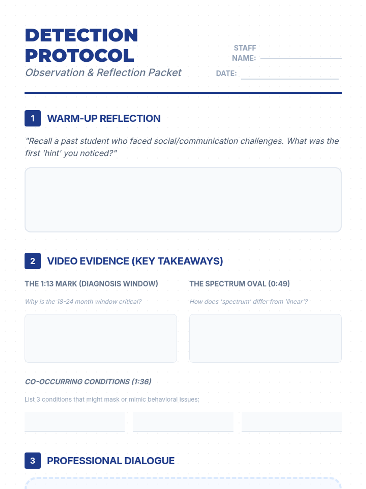 A classroom-ready observation tool for teachers to identify potential "Red Flags" for ASD in the areas of social interaction, sensory responses, and behavioral patterns, including a section for highlighting student strengths.