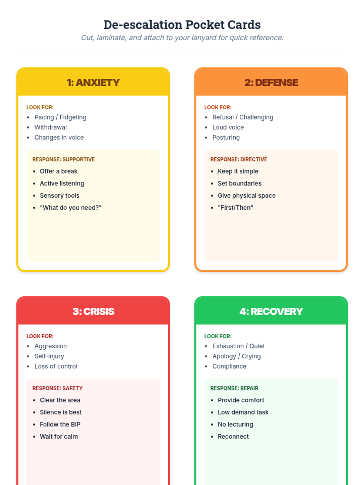 Four pocket-sized reference cards on a single sheet, summarizing the de-escalation cycle phases and appropriate responses for on-the-go support.
