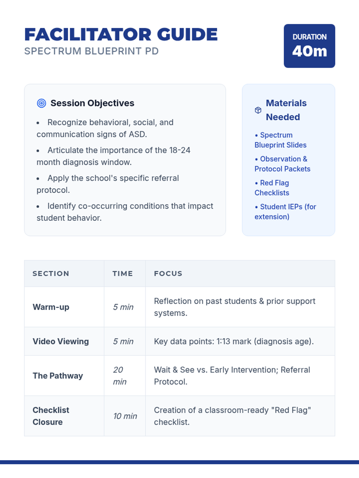 A detailed facilitator guide for the Spectrum Blueprint PD session, providing pacing, scripted discussion prompts, key vocabulary definitions, and tips for addressing common misconceptions about ASD.