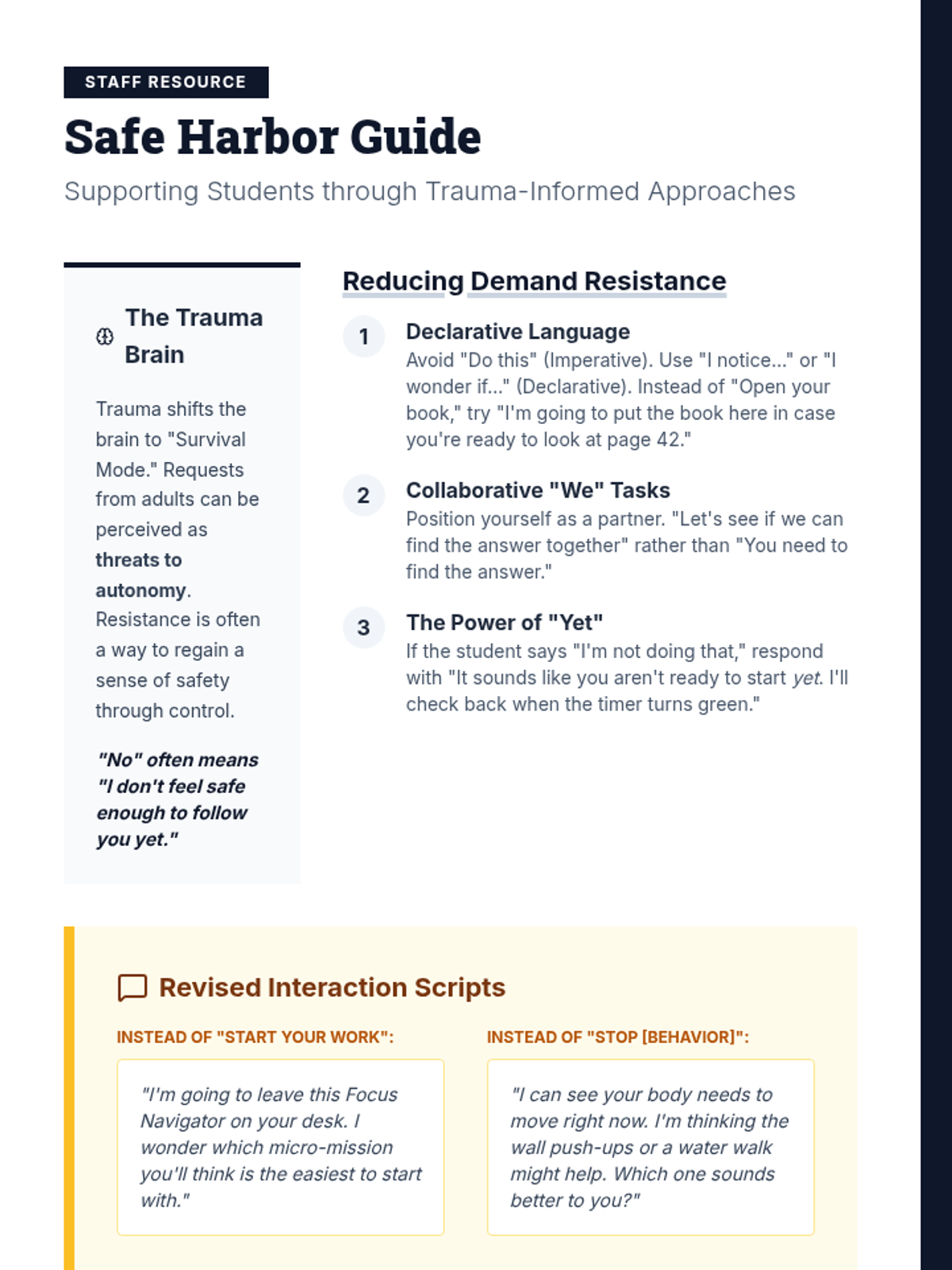 A professional guide for school staff on trauma-informed approaches. It covers the neurobiology of trauma, environmental triggers, de-escalation scripts, and executive functioning supports. Updated to include strategies for managing demand avoidance and autonomy-seeking behaviors.