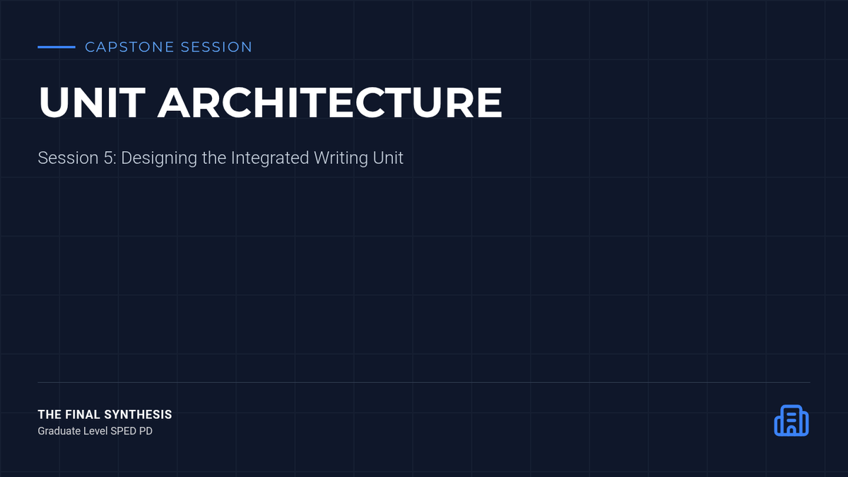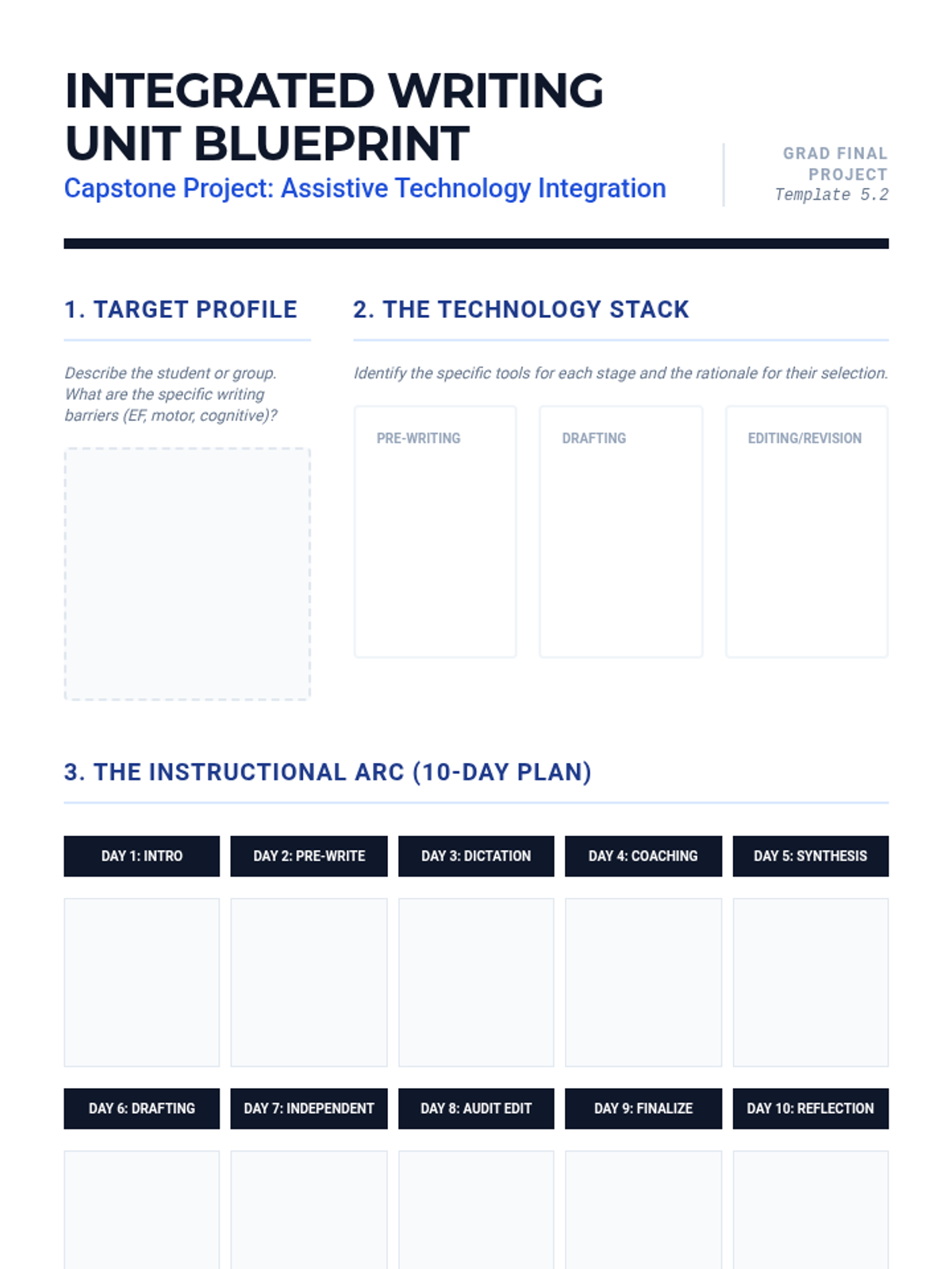 A comprehensive planning template for graduate students to design a 2-week writing unit that integrates assistive technology. Includes sections for student profiling, instructional scaffolding, and fading plans.
