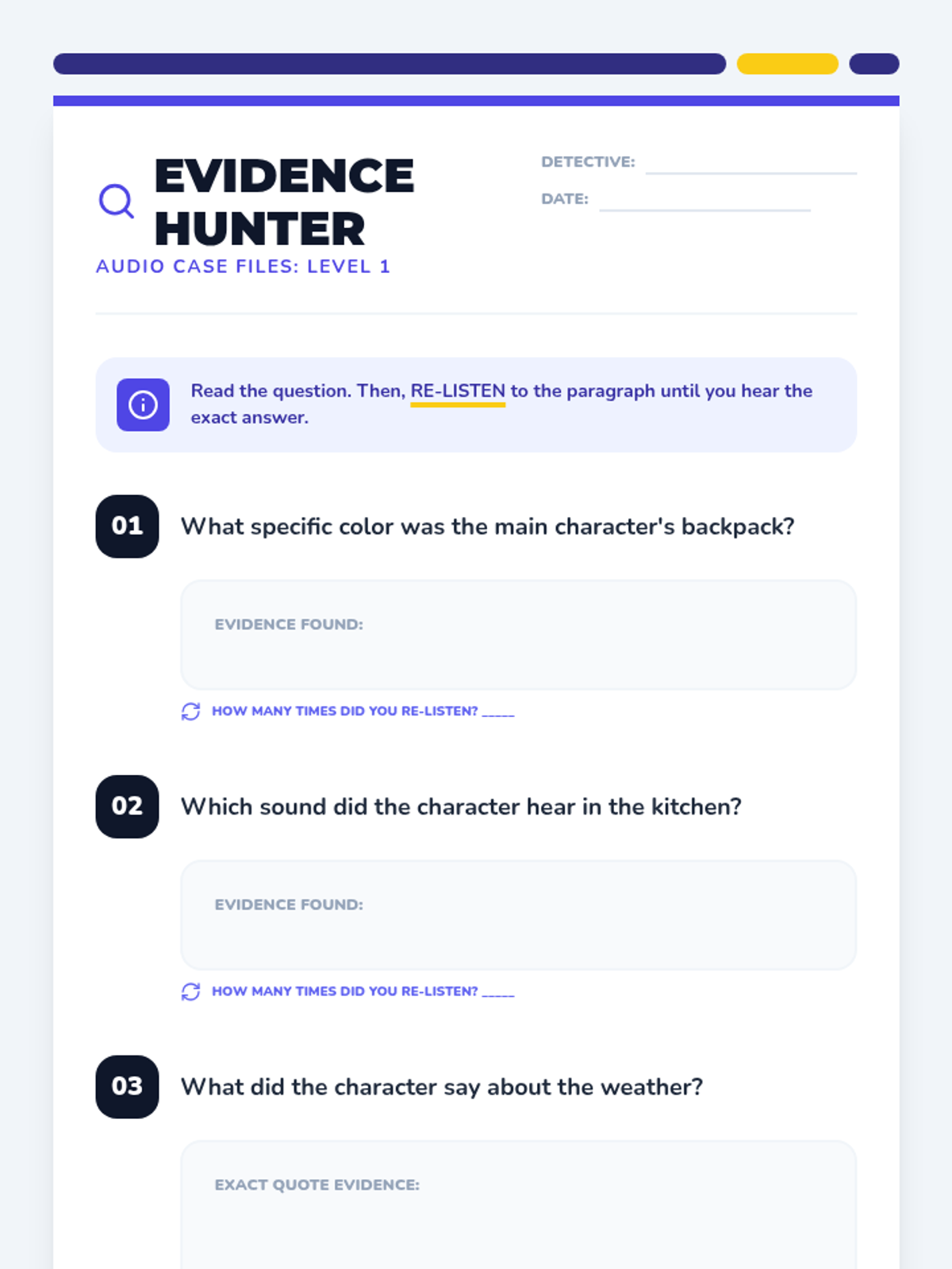 A student worksheet designed as a case file for practicing re-listening skills to find specific details and evidence in a story.