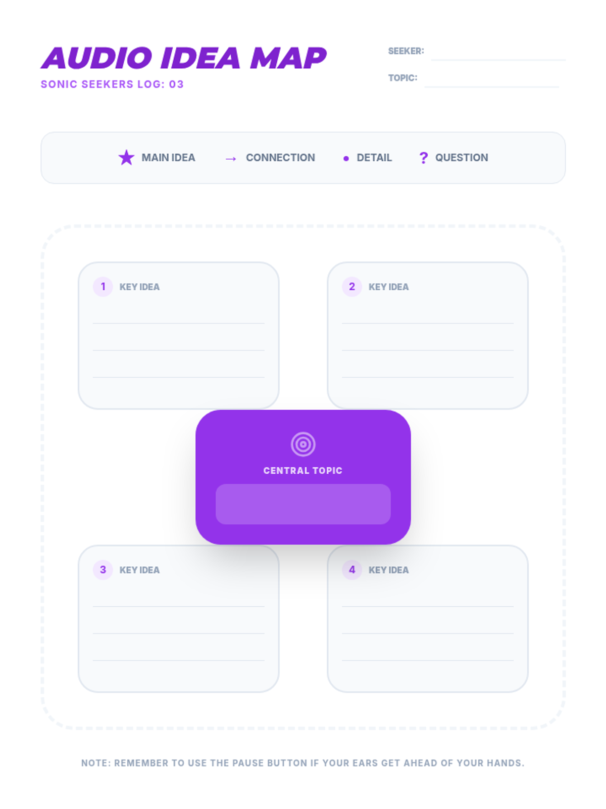 Student mat for organizing index cards during the 'Mining for Nuggets' lesson, providing clear zones for main idea and detail cards.