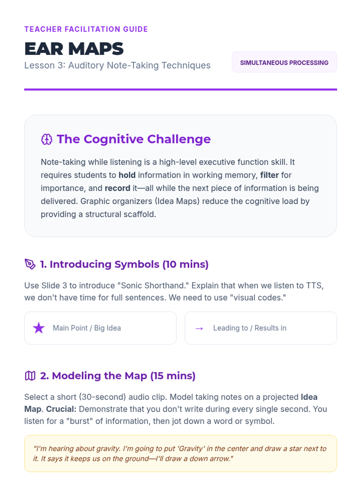 Teacher guide for Lesson 3, providing instructions on teaching auditory shorthand and modeling graphic organizers for auditory input.