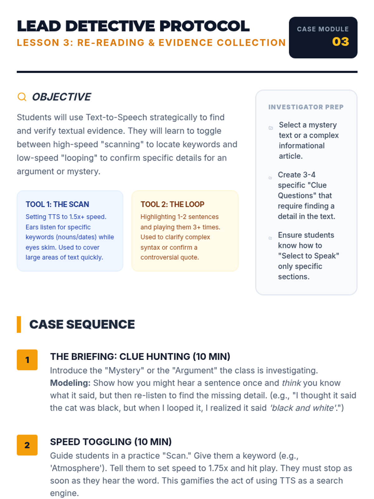 Student activity sheet for Lesson 3, featuring a detective case file layout for evidence collection using TTS scanning and looping strategies.