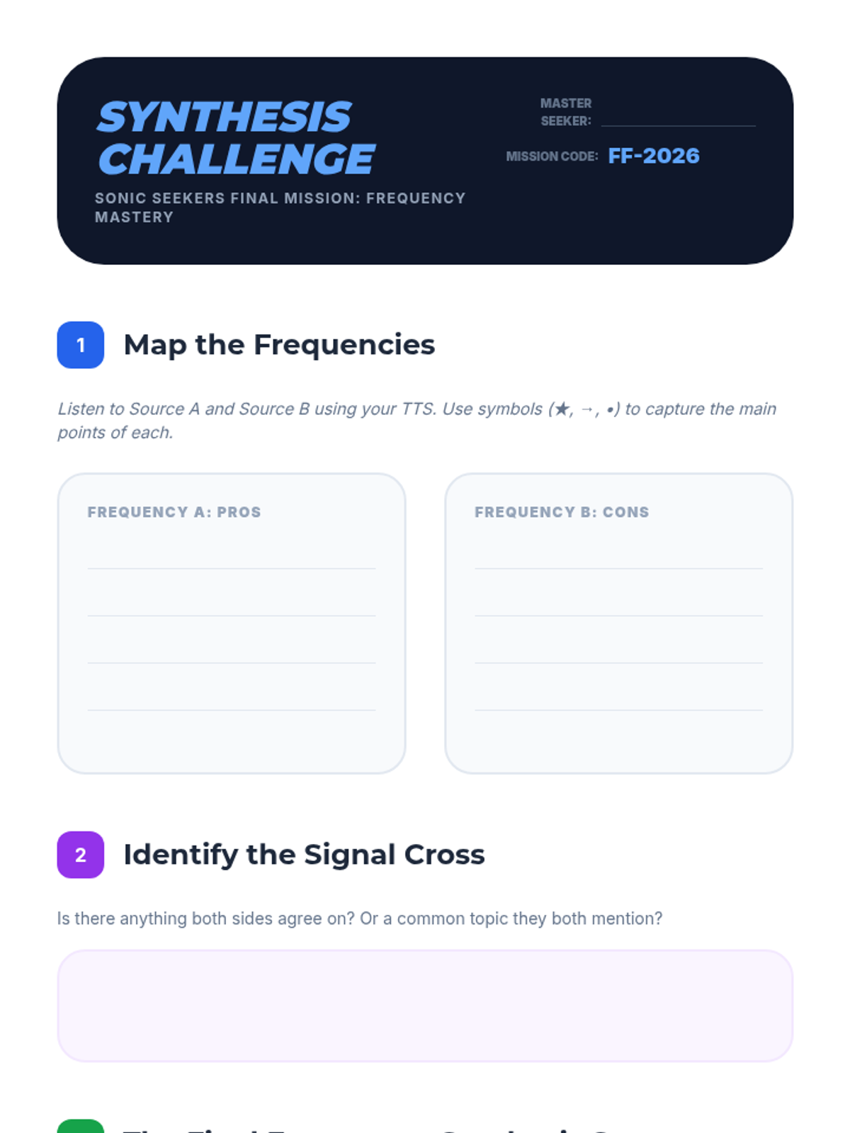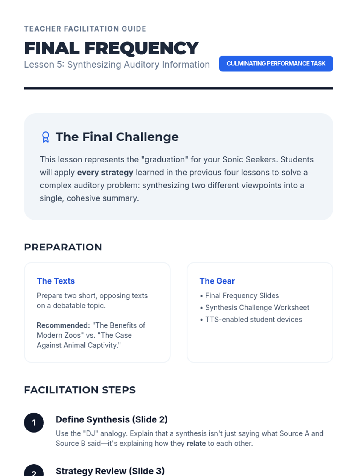 Slide deck for Lesson 5: Synthesizing Auditory Information, introducing the final challenge of summarizing contrasting viewpoints using all previous auditory strategies.