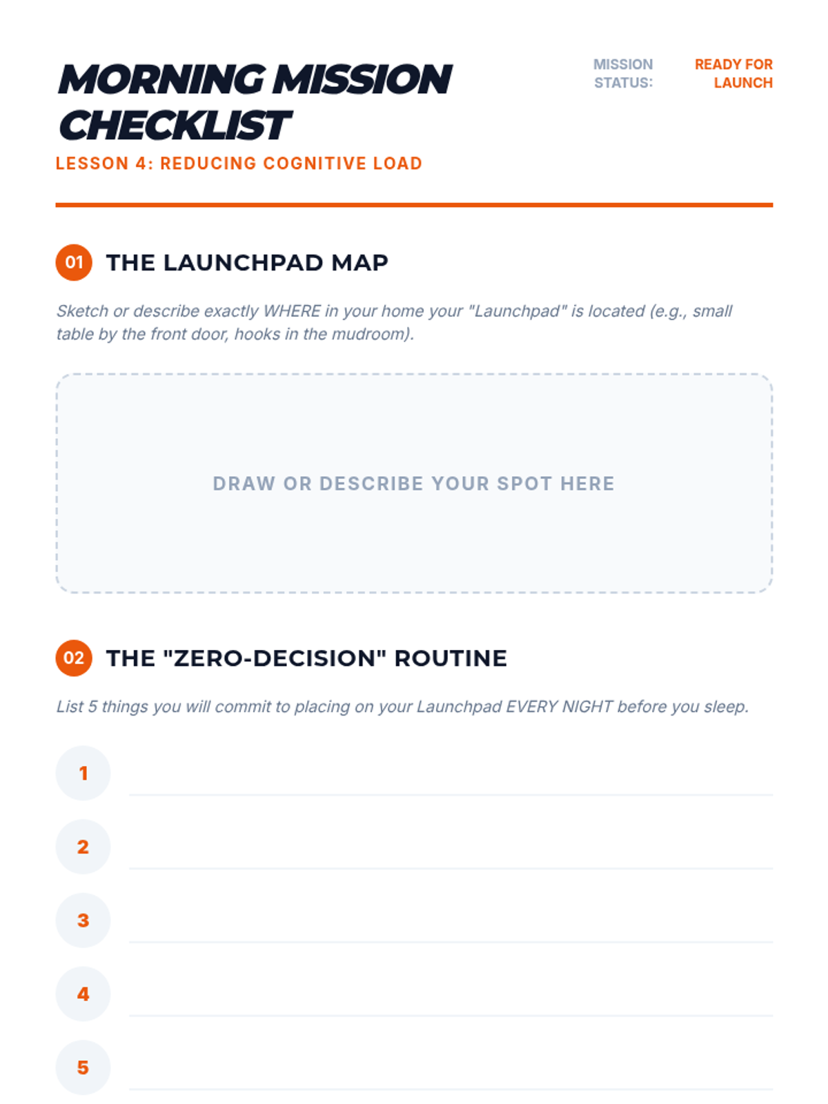 A guide for students to build a 'launchpad' routine and Morning Mission checklist to reduce morning cognitive load.