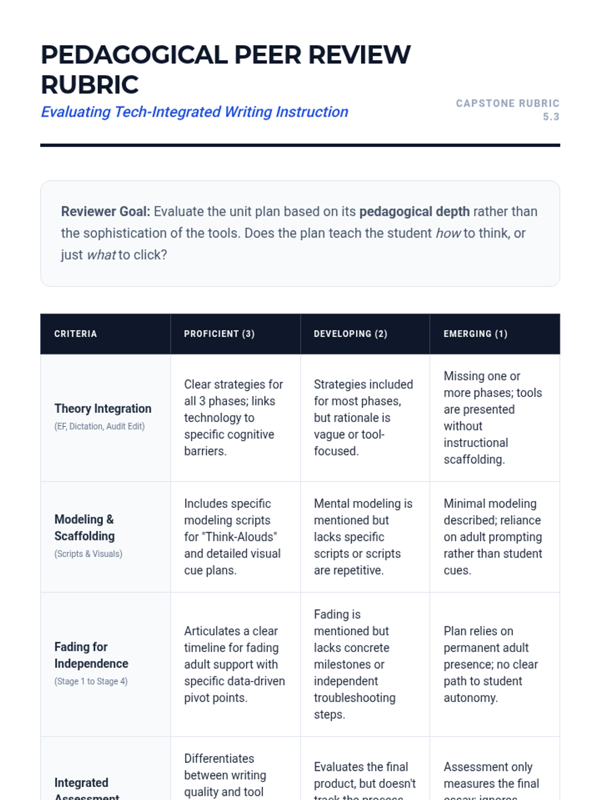 A rubric for peer evaluation of the capstone unit design. Criteria focus on theoretical integration, modeling quality, fading plans, and feasibility.