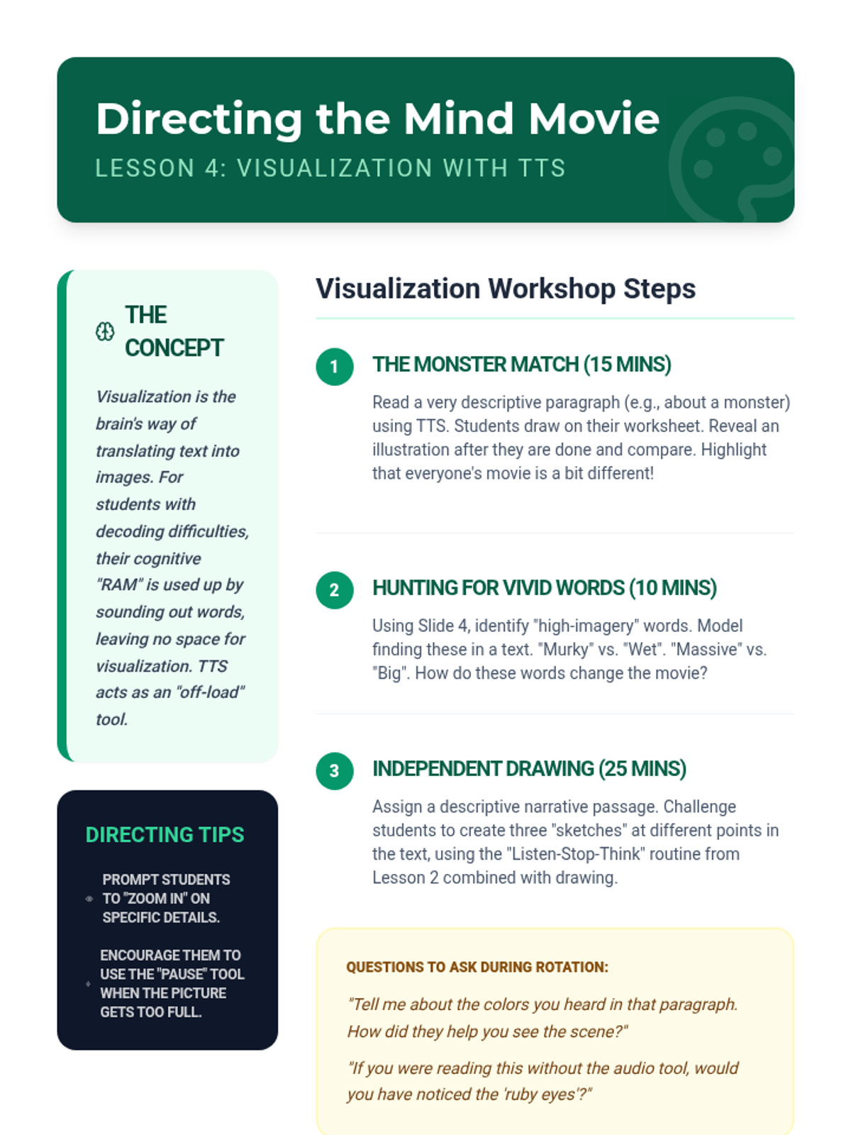 Teacher guide for Lesson 4, facilitating visualization exercises and guiding students to notice descriptive language through audio.