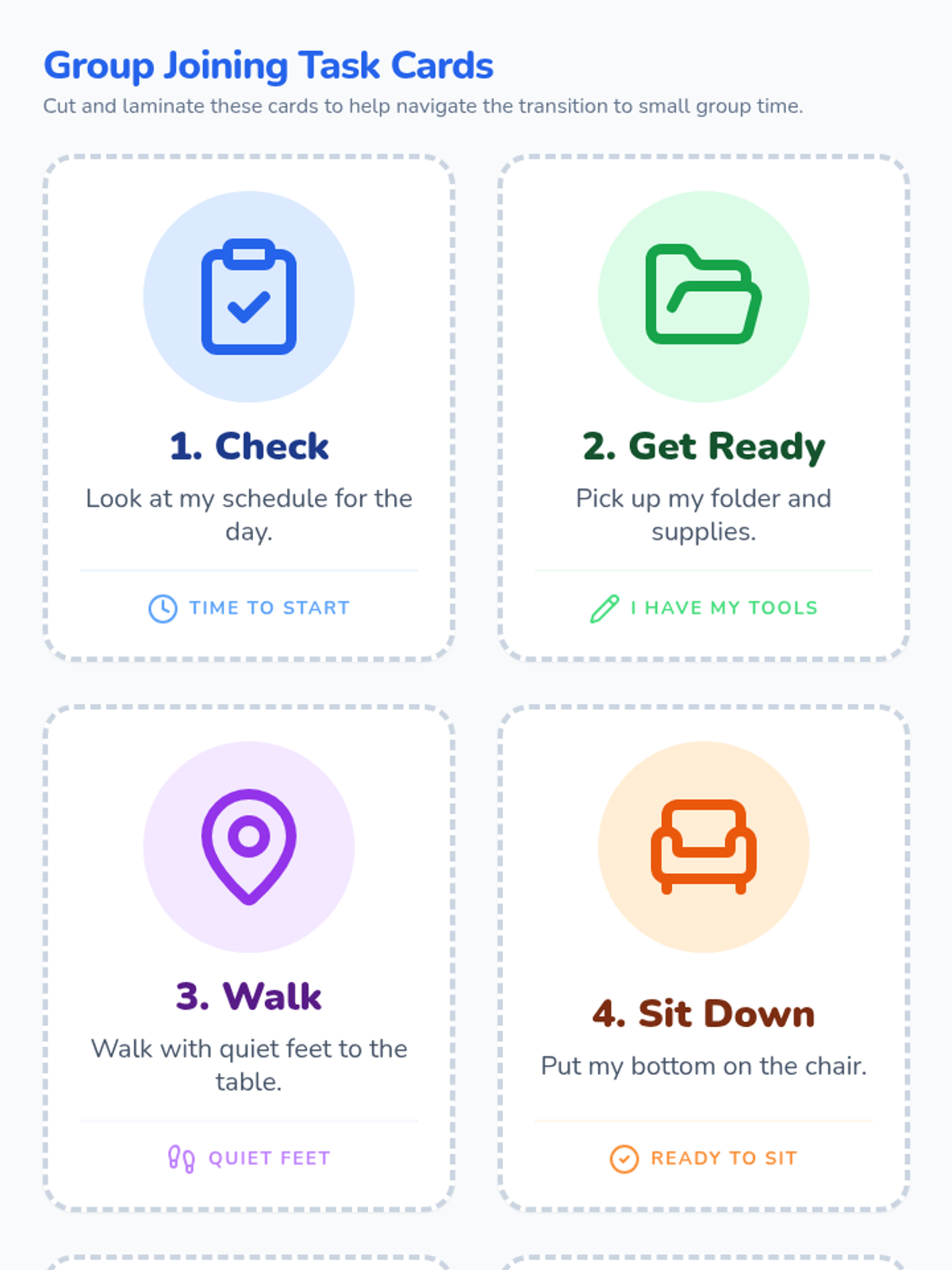 A set of 6 visual task cards designed to guide a student through the specific steps of transitioning to and joining a small learning group.