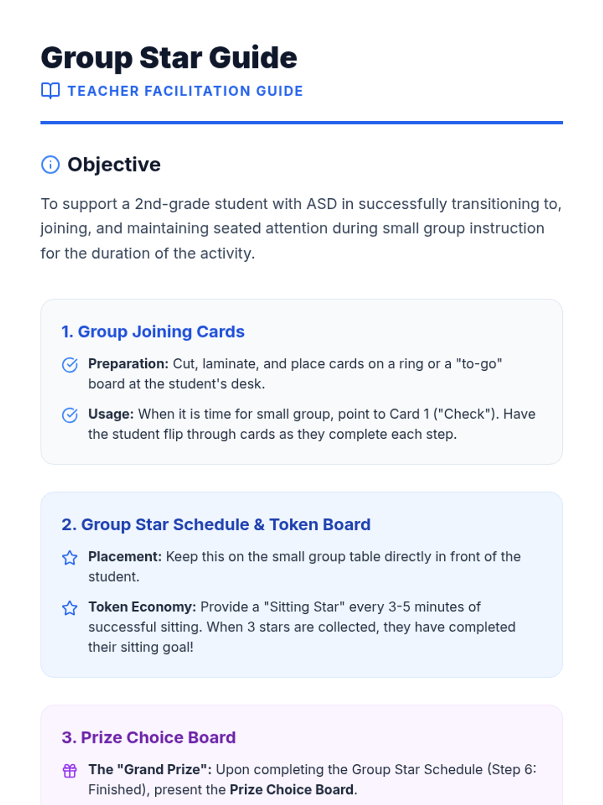 A facilitation guide for teachers outlining how to implement the Group Star visual schedule, token board, and task cards effectively.