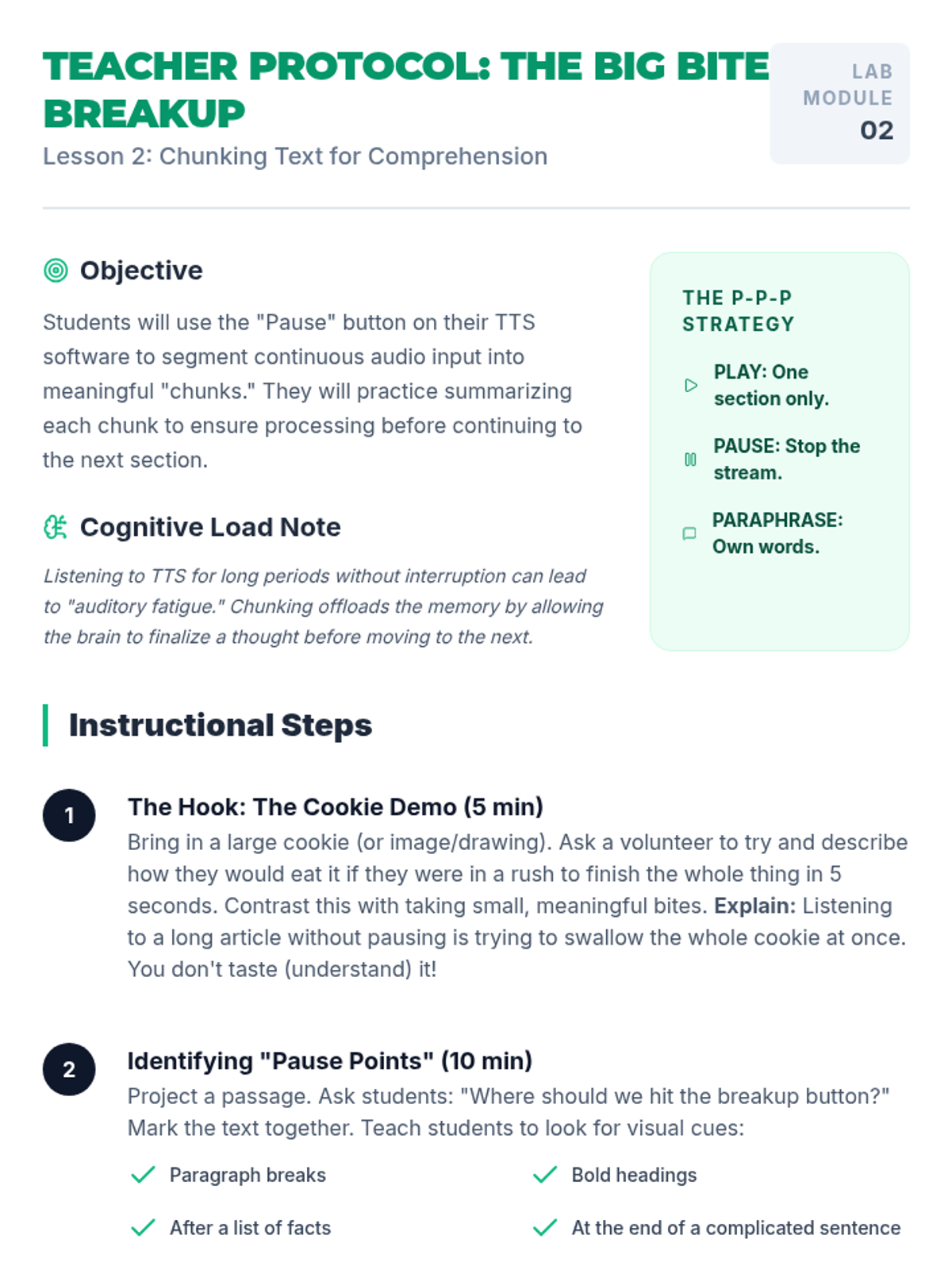 Detailed teacher guide for Lesson 2, focusing on the cookie analogy and the Play-Pause-Paraphrase strategy for auditory comprehension.