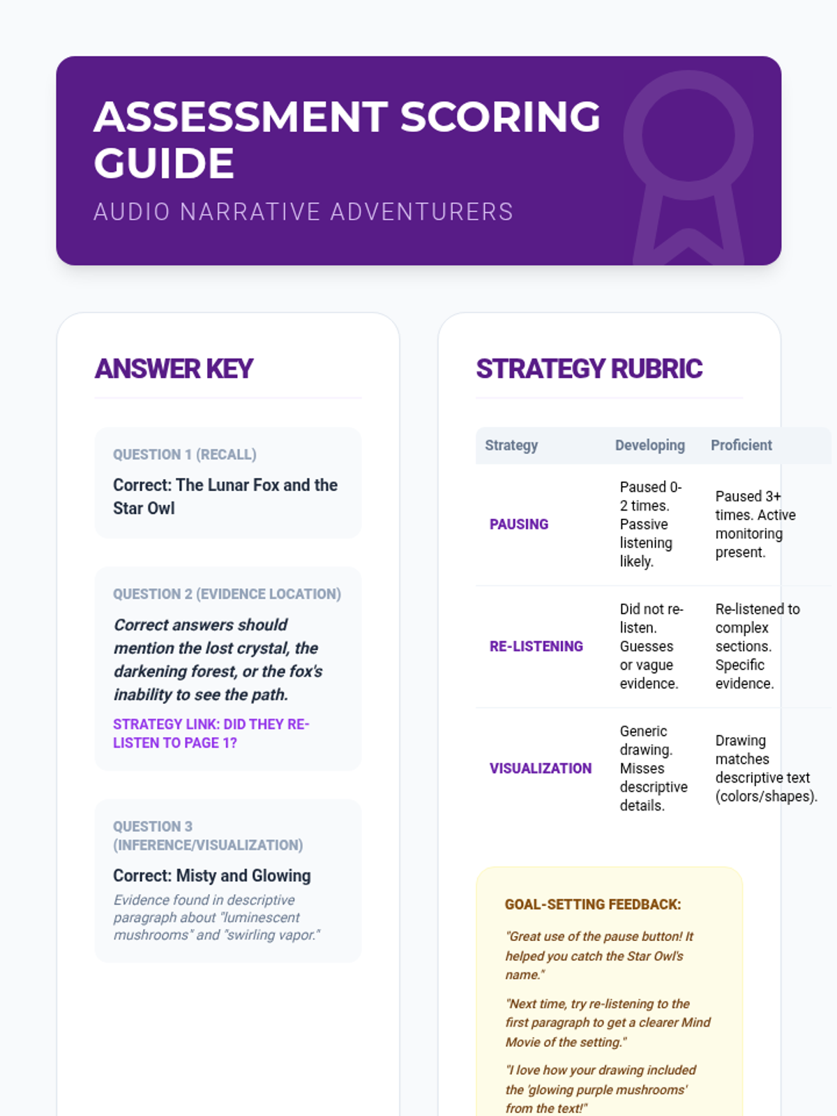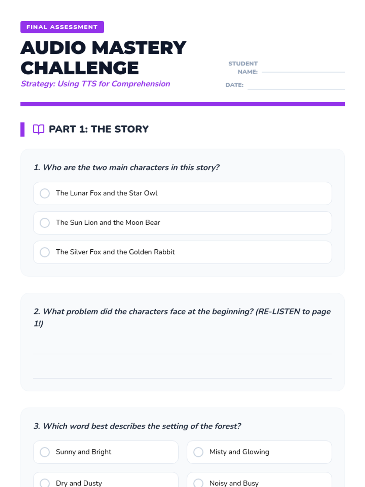 A final assessment for the audio comprehension sequence, testing story understanding and evaluating strategic tool usage (pausing, re-listening, visualization).