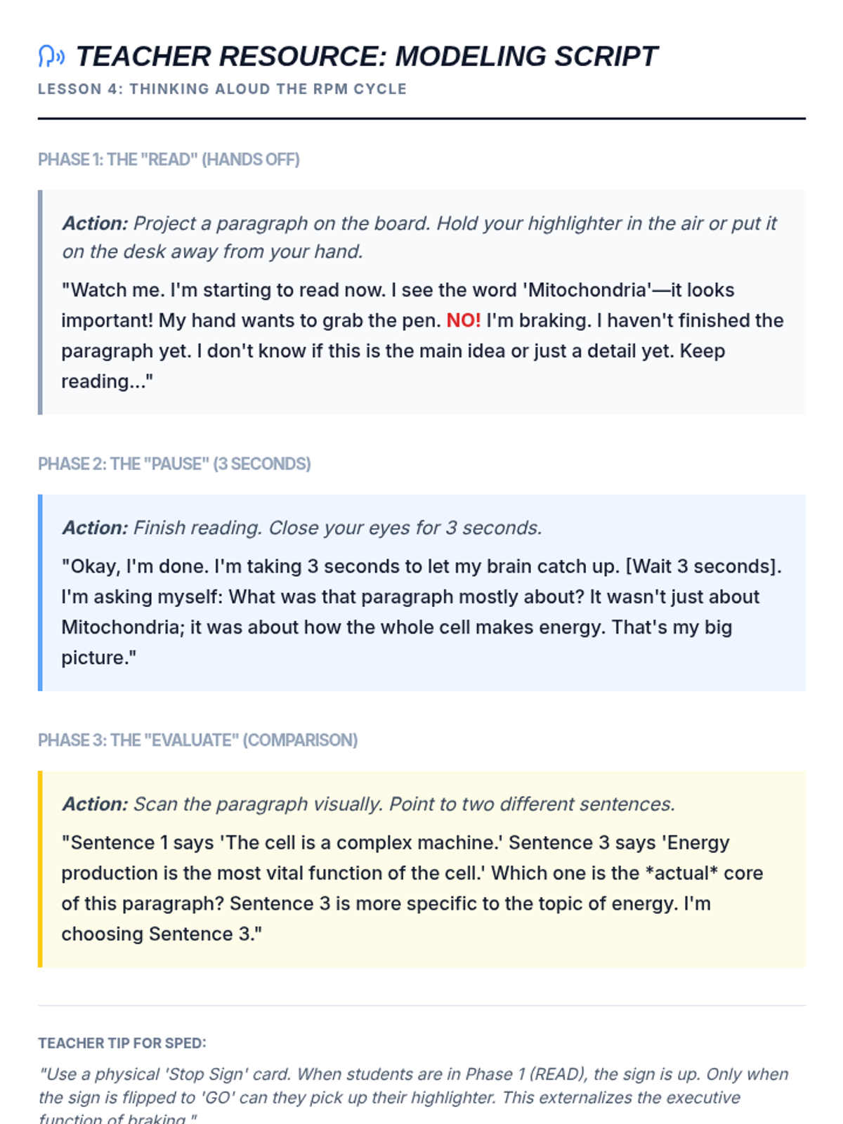 A scripted 'Think Aloud' guide for teachers to model the Read-Pause-Evaluate-Mark cycle, emphasizing the metacognitive process.
